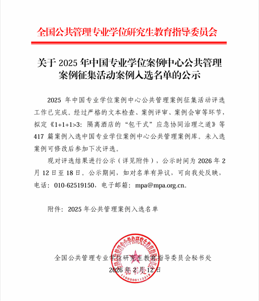 Recently, the National Steering Committee for Postgraduate Education of Public Administration Professional Degrees released the list of selected cases for the 2025 Public Administration Case Collection of the China Professional Degree Case Center. Four outstanding cases submitted by our university’s MPA Education Center were successfully selected. This result not only sets a new record for Shenzhen University in this competition but also fully recognizes the Center’s systematic approach to case-based practical teaching.