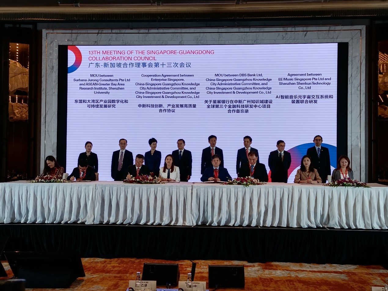 TheSingapore-Guangdong CollaborationCouncil is the most important official cooperation mechanism between the governments of Guangdong Province and Singapore. A total of 21 projects have been signed at the meeting of theSingapore-Guangdong CollaborationCouncil this year, and the Center for ASEAN-Greater Bay Area Studies cooperation project is the first project officially signed at the meeting of theSingapore-Guangdong CollaborationCouncil. The meeting was attended by key leaders from the Ministry of Trade and Industry of Singapore, Intellectual Property Office of Singapore, Monetary Authority of Singapore, Infocomm Media Development Authority of Singapore, General Office of the Guangdong Provincial Government, Development and Reform Commission, Department of Commerce, and Foreign Affairs Office of the Provincial Government.