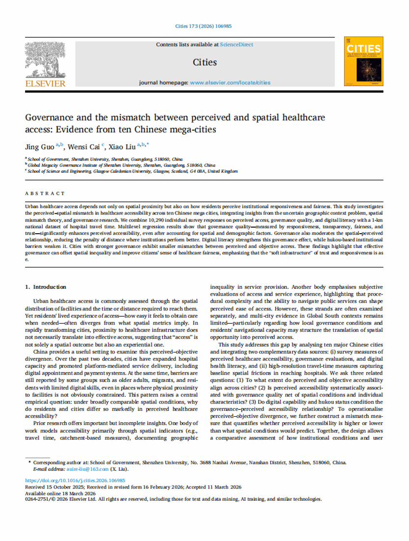 Recently, the paper “Governance and the mismatch between perceived and spatial healthcare access: Evidence from ten Chinese mega-cities,” co-authored by Assistant Professor Guo Jing and Professor Liu Xiao from the Department of Public Policy at our School, together with Dr. Cai Wensi from Glasgow Caledonian University, was published in the internationally prestigious journal Cities. Assistant Professor Guo Jing serves as the first author, Professor Liu Xiao as the corresponding author, and Shenzhen University as the first affiliation.