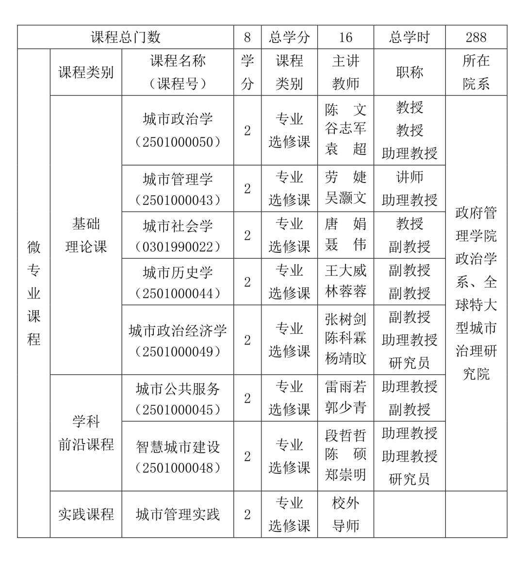 The micro major “Urban Management” intends to enroll students from all undergraduate majors in the university who are interested in the field of urban management and have basic knowledge in related fields. This major will refine the core skills of position groups in the field of urban management, and through the study of 8 core courses, enable the micro major students to quickly master the basic skills in the field of urban management. On the basis of combining with the students’ original major, it will address the matching issues between the major setting and the demand of the country and society for urban management talents, and enhance the competitiveness of the students in the field of urban management, especially when applying for civil servants, public institutions and other channels, with an expectation to cultivate urban management innovation and entrepreneurship talents in the new era who are politically firm, proficient in urban management theories, familiar with urban management practices, and interested in social public services for the Guangdong-Hong Kong-Macao Greater Bay Area and the pilot demonstration zone of socialism with Chinese characteristics.