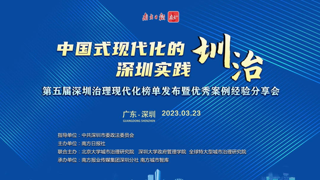 “中国式现代化的深圳实践——圳治”第五届深圳治理现代化榜单发布暨优秀案例经验交流会顺利举行3月23日14点30分,“中国式现代化的深圳实践——圳治”第五届深圳治理现代化榜单发布暨优秀案例经验交流会正式举行。北京大学城市治理研究院院长、深圳大学政府管理学院院长俞可平教授;深圳大学政府管理学院党委书记、全球特大型城市治理研究院执行院长陈文教授出席活动。为深入学习宣传贯彻党的二十大精神,全面总结梳理中国式现...