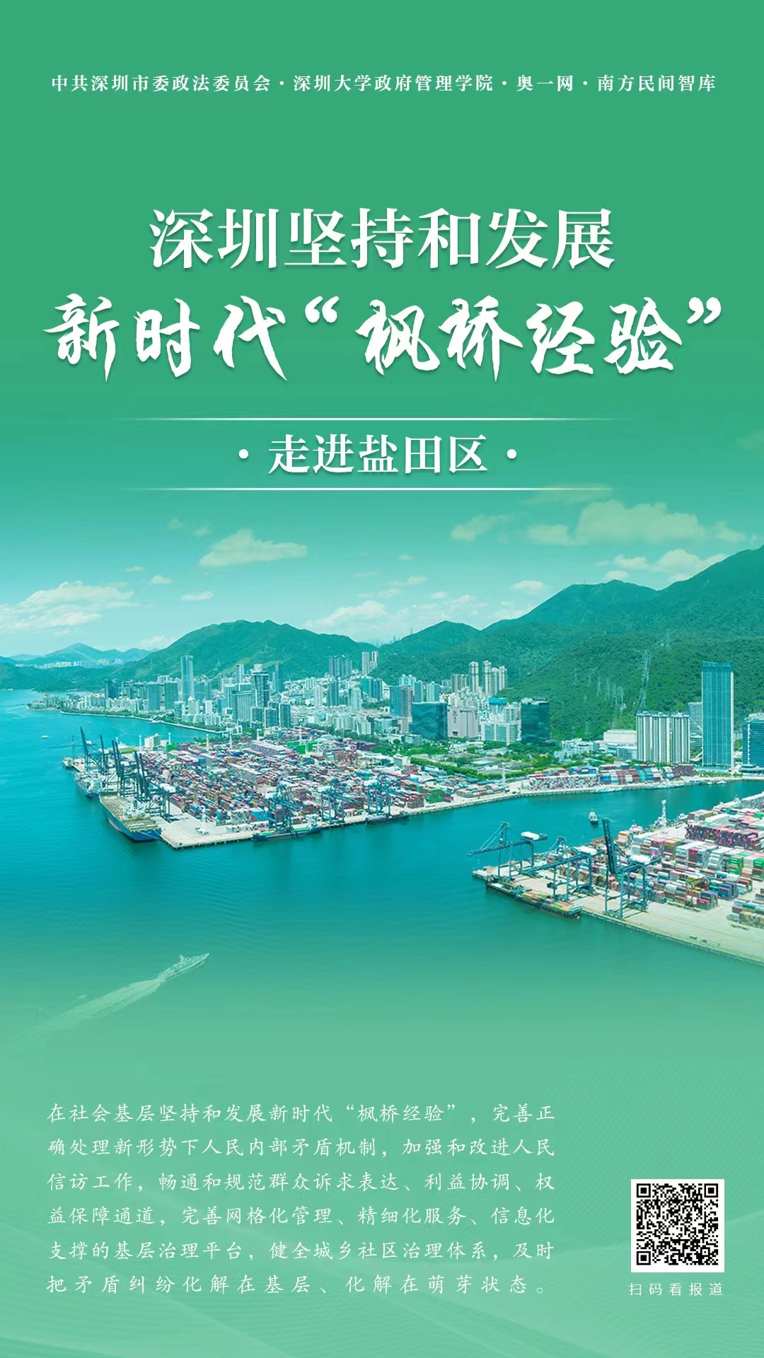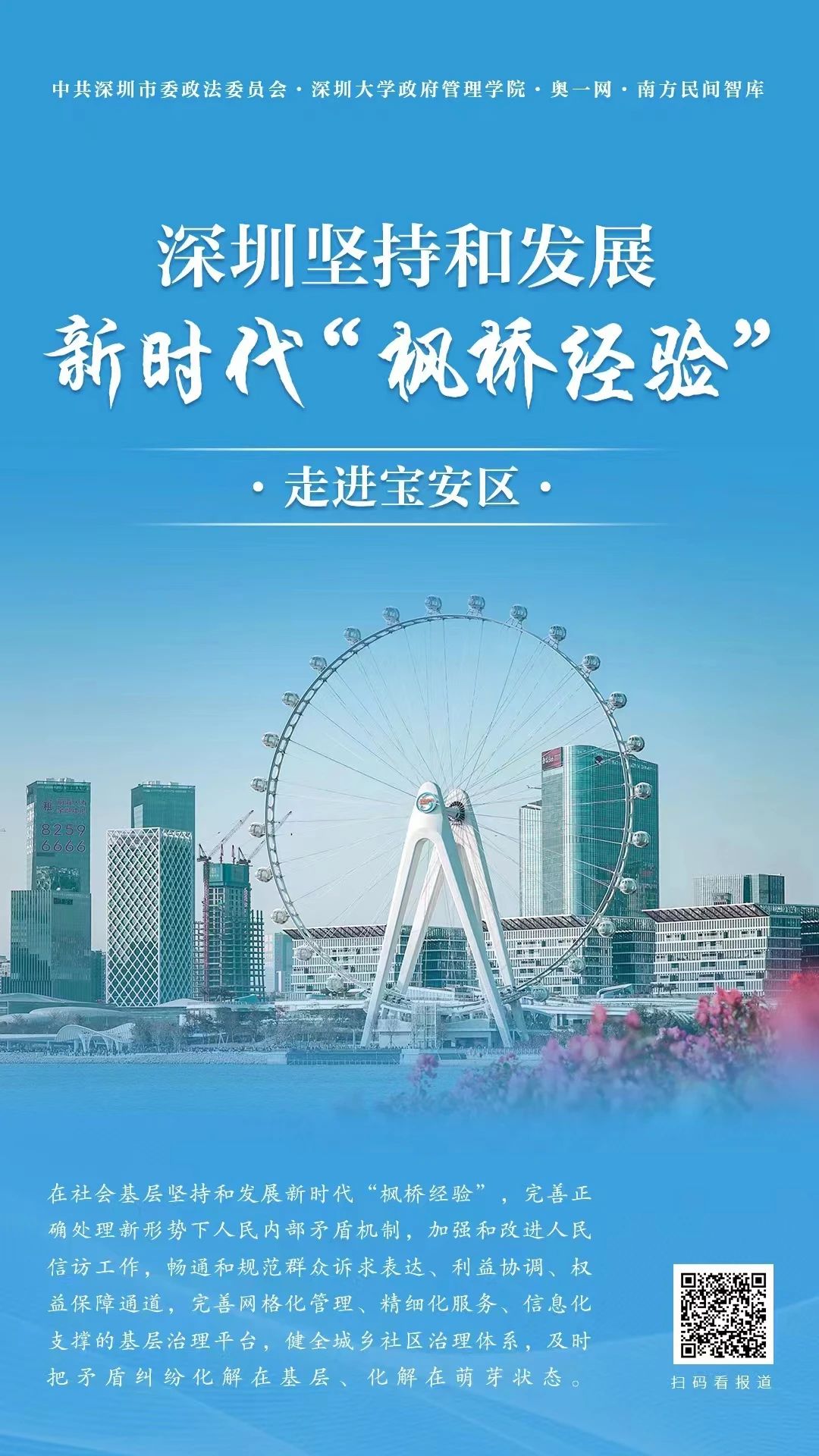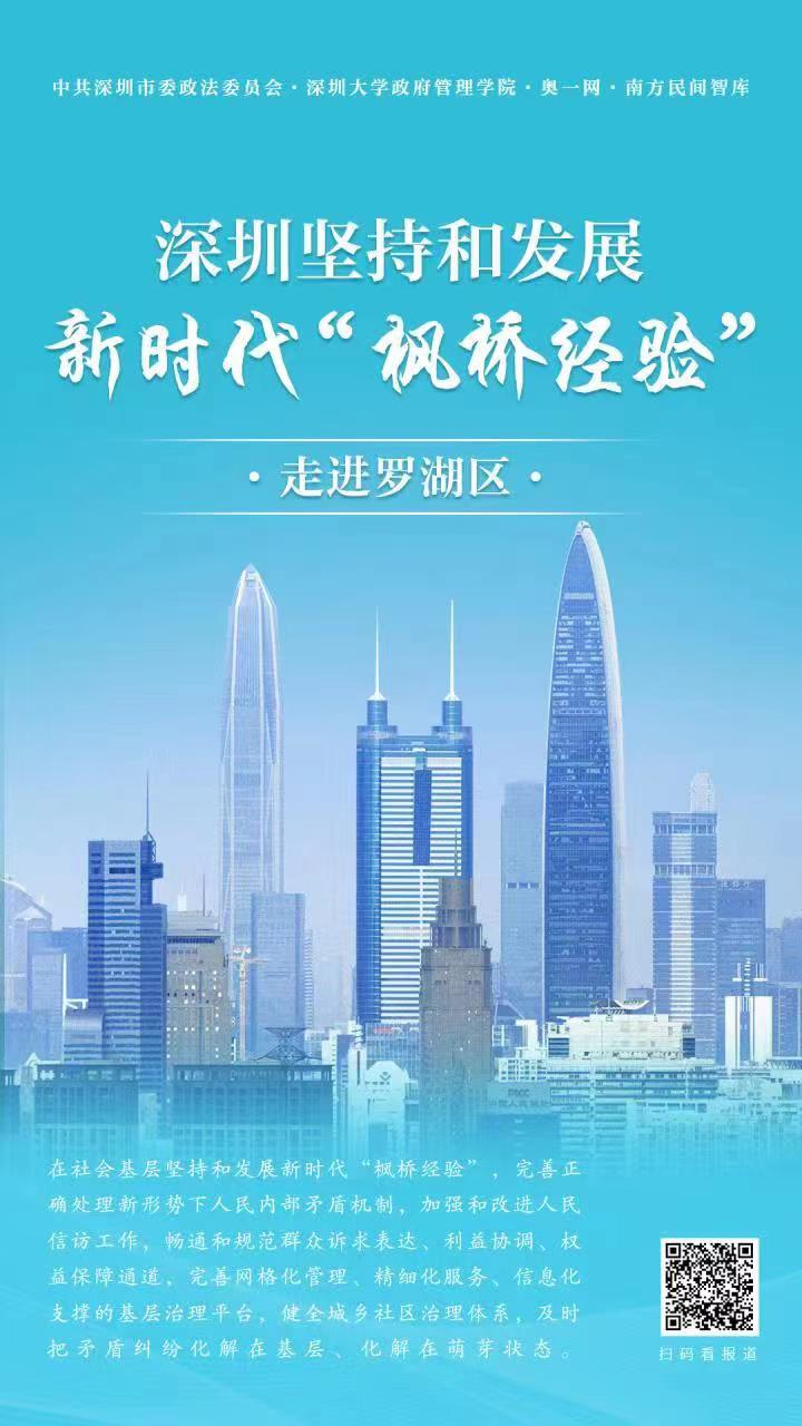 正值“枫桥经验”六十周年之际,中共深圳市委政法委员会联合深圳大学政府管理学院、奥一网、南方民间智库在全市开展“深圳坚持和发展新时代‘枫桥经验’大调研”,在实践基础上进行学理性的概括提炼,在推进社会治理现代化的语境下,进一步丰富和发展新时代“枫桥经验”。“坚持源头治理,突出全周期理念” “系统梳理重点领域信访问题,着力探索开展源头治理工作”“急群众之所急,主动把便民高效的服务送到群众家门口” …...
