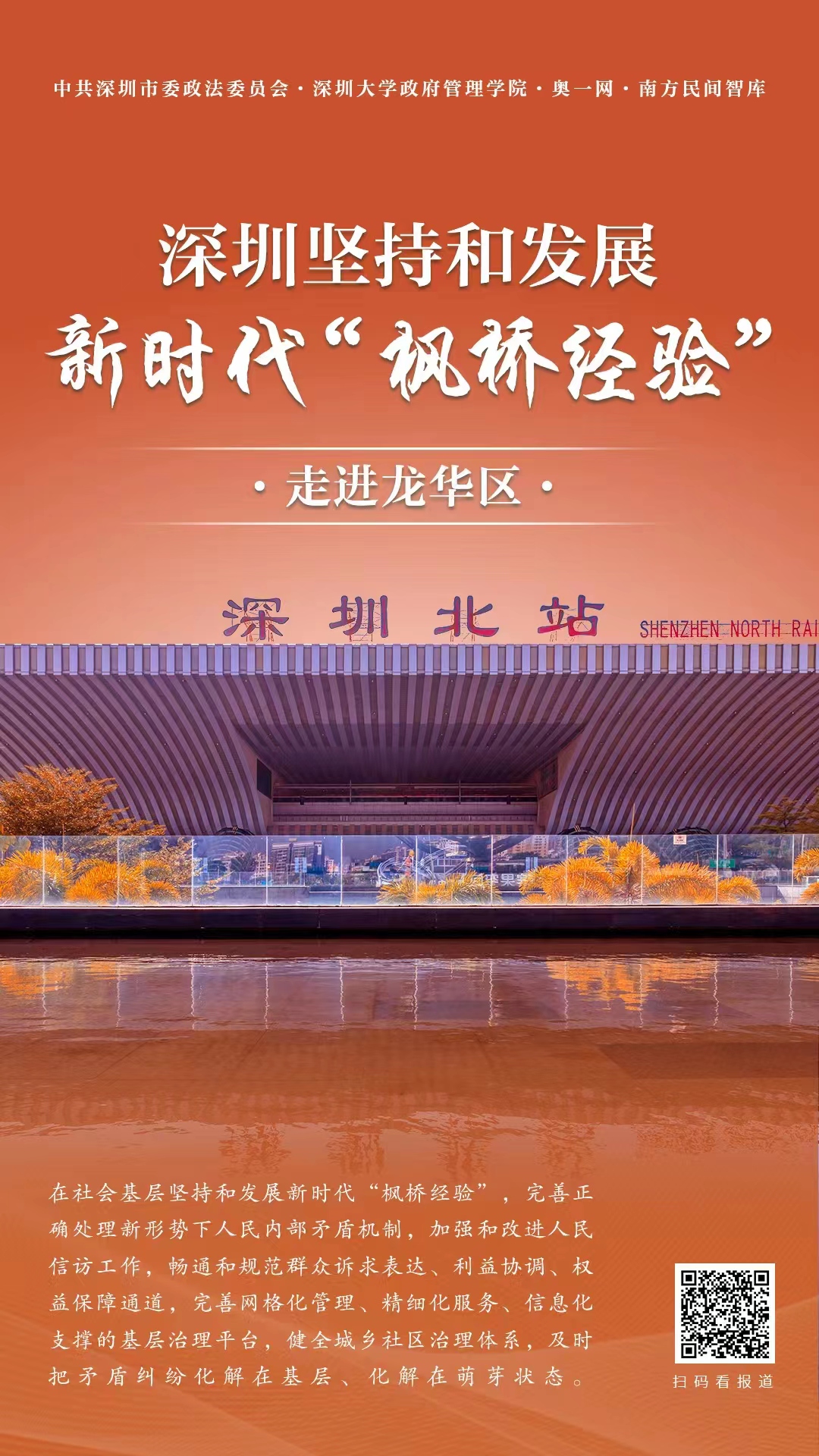 正值“枫桥经验”六十周年之际,中共深圳市委政法委员会联合深圳大学政府管理学院、奥一网、南方民间智库在全市开展“深圳坚持和发展新时代‘枫桥经验’大调研”,在实践基础上进行学理性的概括提炼,在推进社会治理现代化的语境下,进一步丰富和发展新时代“枫桥经验”。“升级@龙华——民意速办平台,实现民生诉求‘全口径’信息接入,数据统一汇聚” “划分512个街区网格,近3000名干部入格管理”“将建立一个矛盾纠纷调解中...