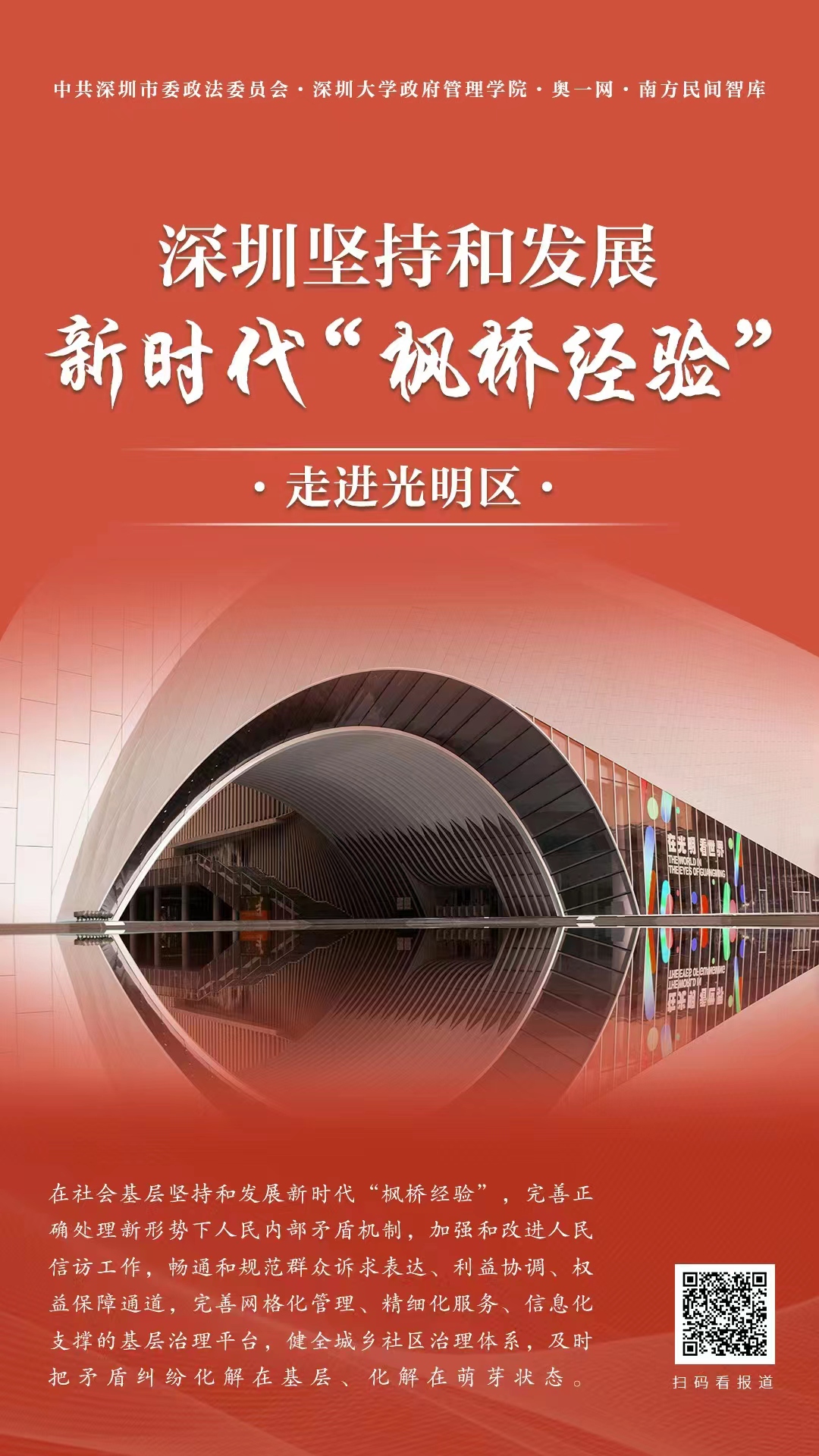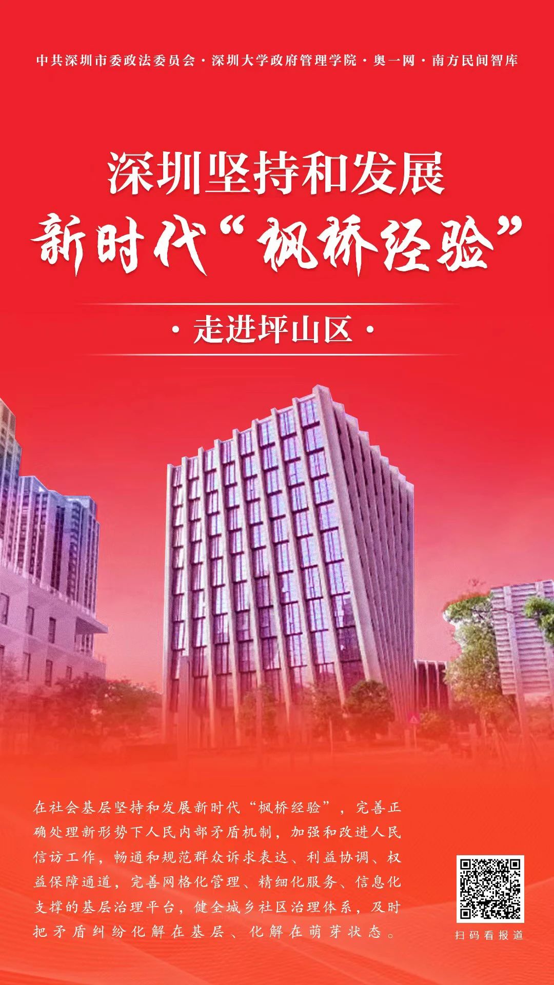 正值“枫桥经验”六十周年之际,中共深圳市委政法委员会联合深圳大学政府管理学院、奥一网、南方民间智库在全市开展“深圳坚持和发展新时代‘枫桥经验’大调研”,在实践基础上进行学理性的概括提炼,在推进社会治理现代化的语境下,进一步丰富和发展新时代“枫桥经验”。“充分发挥人民群众在基层治理中的主体作用,为纠纷调解提供民间智慧支撑”“强化资源整合,打造矛盾纠纷化解线上线下‘主阵地’” ……6月30日,“深圳坚...