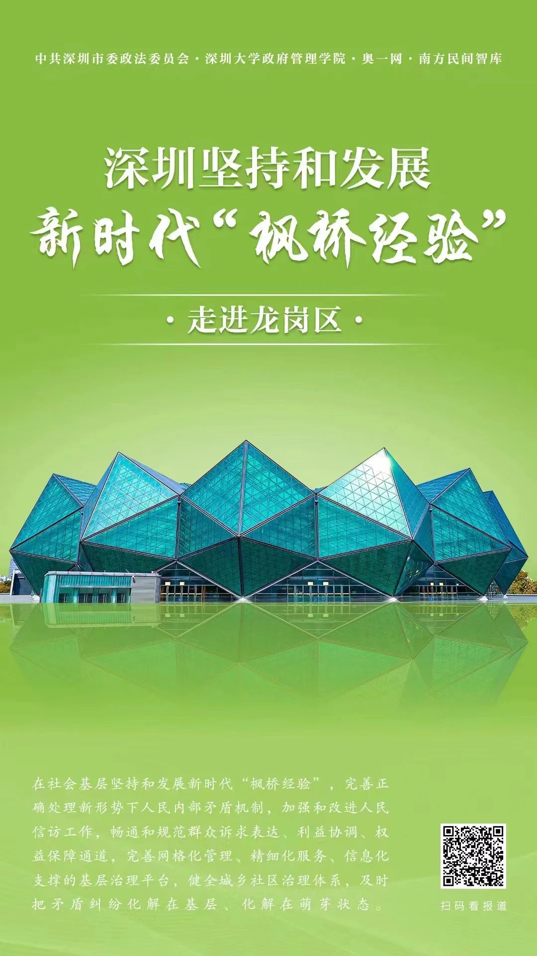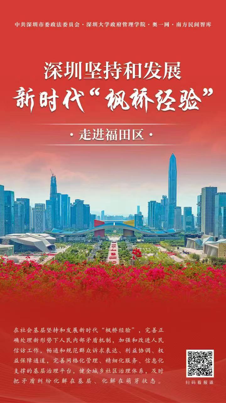 正值“枫桥经验”六十周年之际,中共深圳市委政法委员会联合深圳大学政府管理学院、奥一网、南方民间智库在全市开展“深圳坚持和发展新时代‘枫桥经验’大调研”,在实践基础上进行学理性的概括提炼,在推进社会治理现代化的语境下,进一步丰富和发展新时代“枫桥经验”。“推进一站式诉讼服务体系建设,采取‘诉前、诉中、判后’全链条调解模式”“强化平台建设,打造区-街道-社区-服务站四级群众诉求服务平台,确保全口径...
