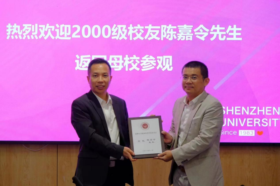 座谈会最后,陈文书记代表学院向陈嘉令校友颁发政府管理学院第一届校友会理事会会长牌匾,大家合影留念。