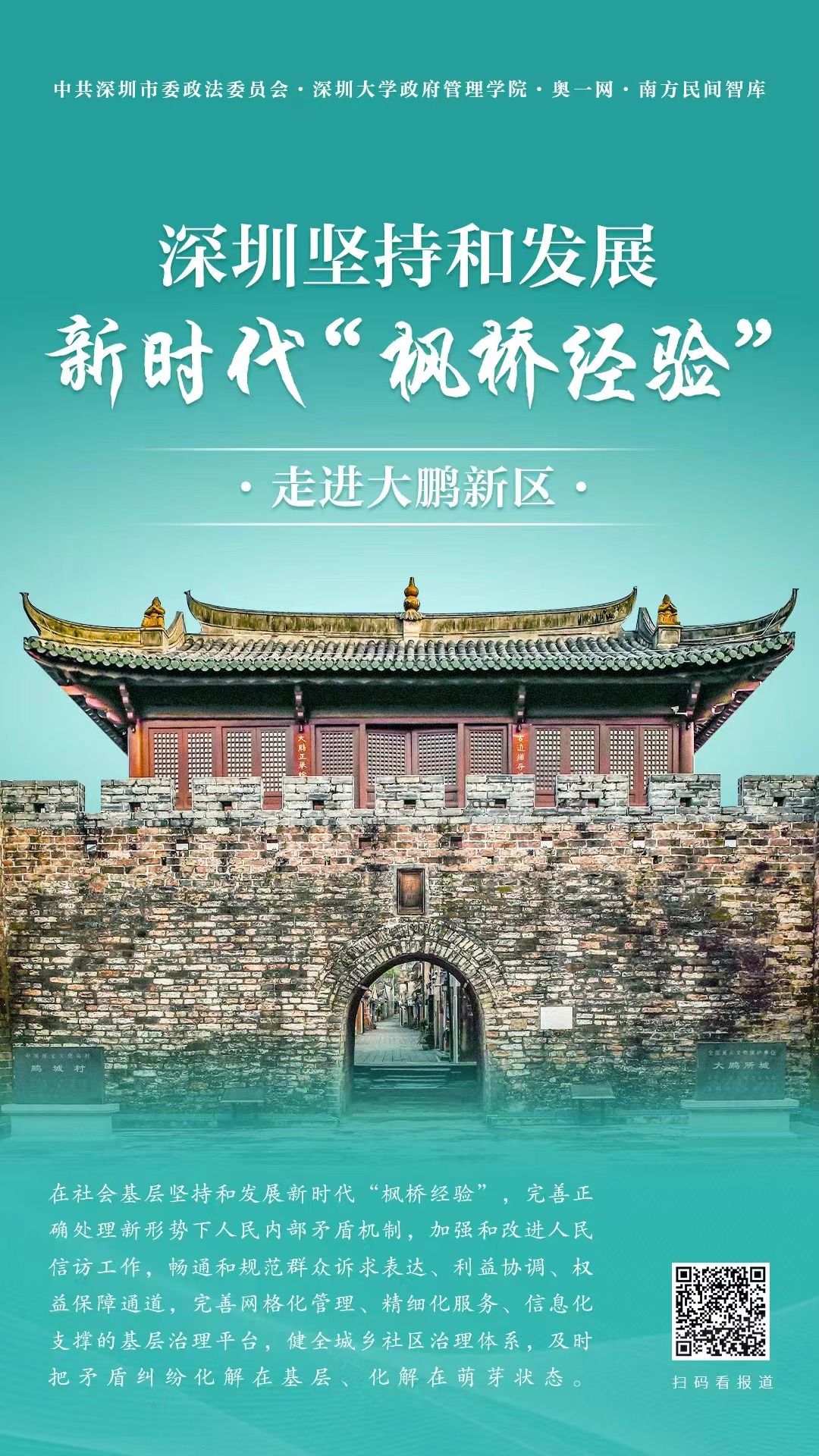 正值“枫桥经验”六十周年之际,中共深圳市委政法委员会联合深圳大学政府管理学院、奥一网、南方民间智库在全市开展“深圳坚持和发展新时代‘枫桥经验’大调研”,在实践基础上进行学理性的概括提炼,在推进社会治理现代化的语境下,进一步丰富和发展新时代“枫桥经验”。