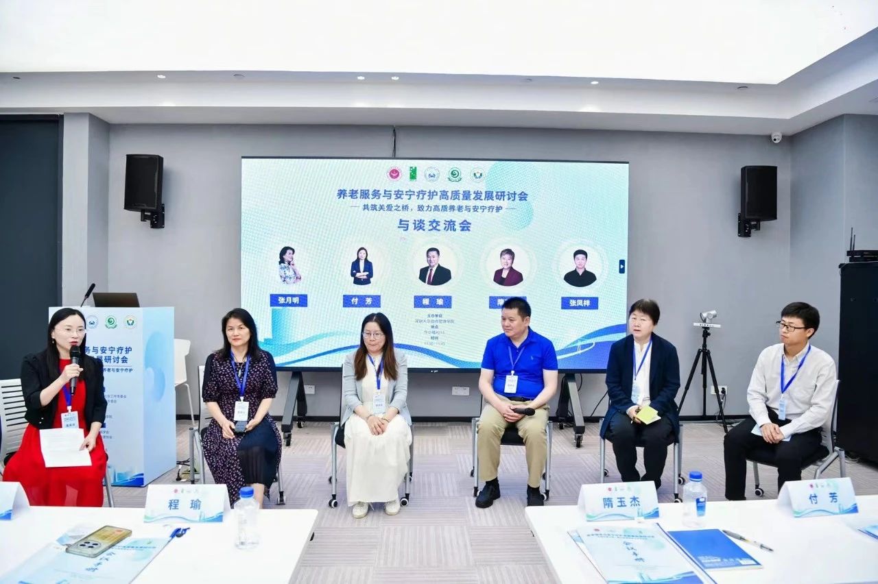 在嘉宾与谈交流会环节,中国生命关怀协会人文护理专业委员会副主任委员,中山大学社会学与人类学学院和中山大学中山医学院和中山大学附属第七医院程瑜双聘教授,中国社会工作教育协会老年社会工作专委会主任,中国人民大学社会工作系隋玉杰副教授,复旦大学社会发展与公共政策学院社会工作系副系主任付芳副教授,深圳市生前预嘱推广协会副秘书长,深圳慈海医院张月明经营主任和香港大学深圳医院肿瘤医学中心张凤祥医务社会工作师,分别针对两个议题进行了深度讨论:养老服务和安宁疗护领域存在的挑战、应对策略、未来发展以及跨界合作。