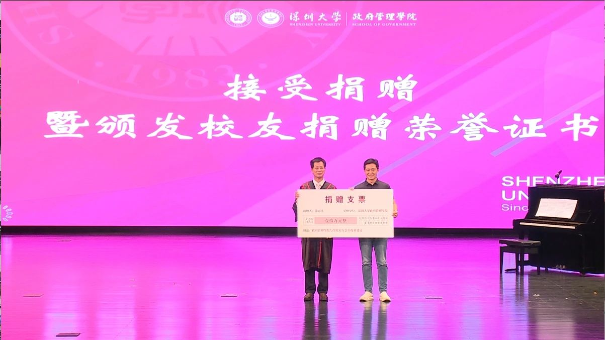 俞可平院长代表学院接受捐赠,并为校友颁发捐赠荣誉证书。此次捐赠活动是一次生动的感恩教育课,也是一次鲜明的自强奋斗教育课,希望全体学生能奋力拼搏,不负时代,不负韶华,积极建功立业。