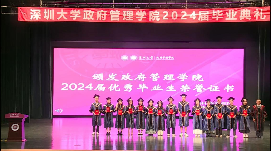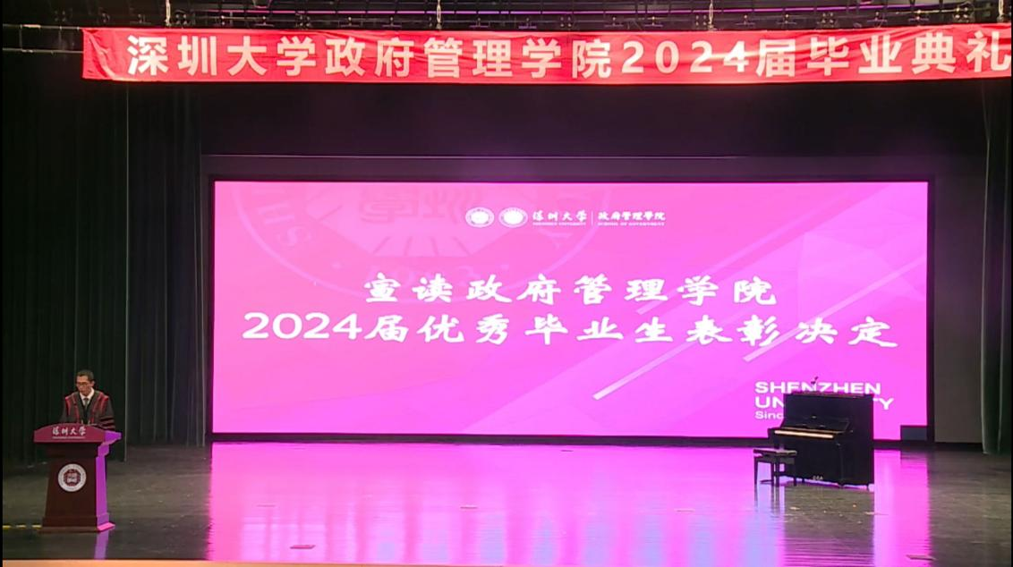 盛夏已至,荔香满园。6月30日,深圳大学政府管理学院2024届毕业典礼在丽湖校区隆重举行,2024届本科、硕士毕业生及其亲友参加了典礼。深圳大学党委副书记吴报水、政府管理学院院长俞可平、党委书记陈文、党委副书记张国强、副院长谷志军,马得勇、罗文恩、段哲哲等系主任、赵宇峰、唐娟、唐咏等学科点负责人,班主任、辅导员和其他教师代表,家长代表谭能,以及学院优秀校友代表陈嘉令、陈志杰、涂春光、潘春武出席本次典礼,共同见证了2024届毕业生的重要时刻。