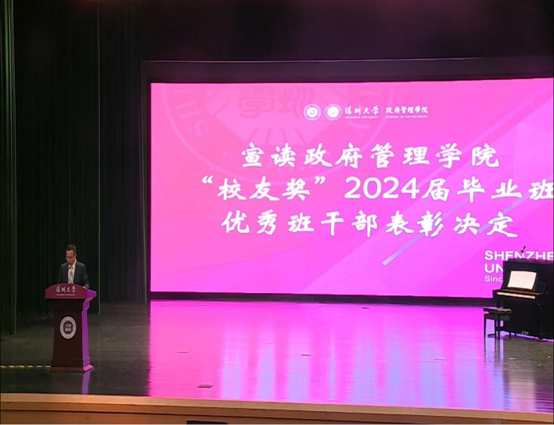 随后,陈文书记宣读政府管理学院“校友奖”2024届毕业班优秀班干部表彰决定,校友代表向获奖学生颁发政府管理学院“校友奖”2024届毕业班优秀班干部荣誉证书。学院校友会秘书长潘春武宣读《关于增补政府管理学院校友会理事的决定》,由学院校友会会长陈嘉令为2024届毕业班康铠文等11位校友颁发政府管理学院校友会新增理事聘书。