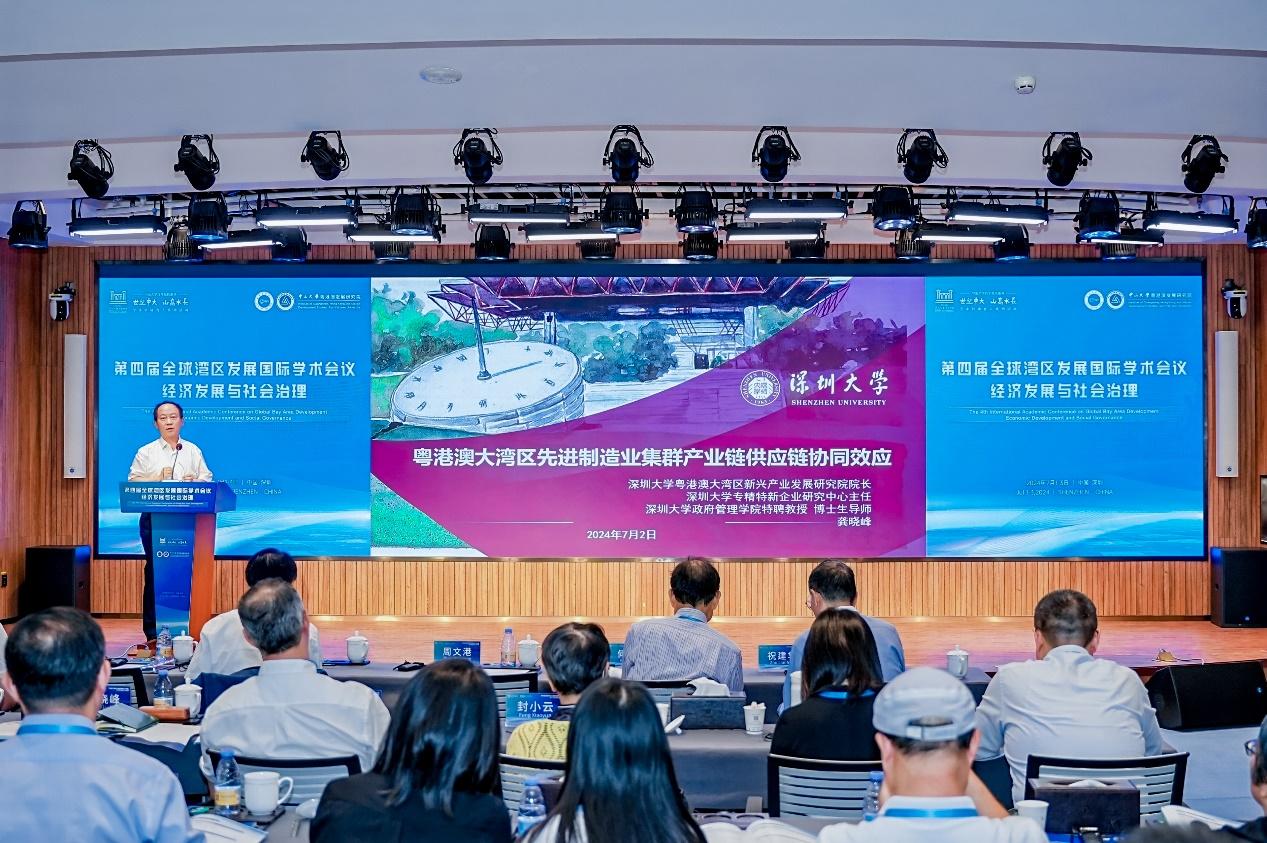 7月2至3日,“第四届全球湾区发展国际学术会议”在深圳举行。此次会议以“经济发展与社会治理”为主题,通过现场会议、网络连线等方式进行研讨交流。鉴于深圳大学粤港澳大湾区新兴产业发展研究院(以下简称“深大新兴院”)对于粤港澳大湾区的经济政策尤其是新兴产业政策的研究基础,深大新兴院院长龚晓峰应邀参加会议,并就湾区先进制造业产业链供应链协同效应等专题作发言。