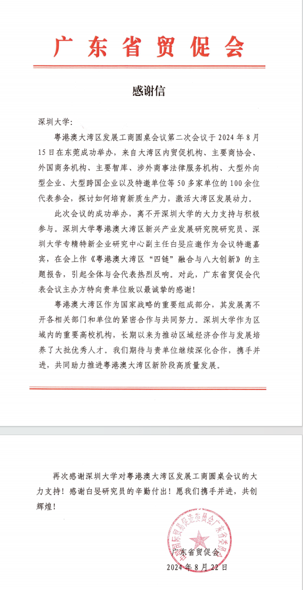 对此,广东省贸促会对深圳大学以及白旻研究员的支持与帮助表示感谢,并寄出感谢信一封,希望携手共进,共创辉煌。