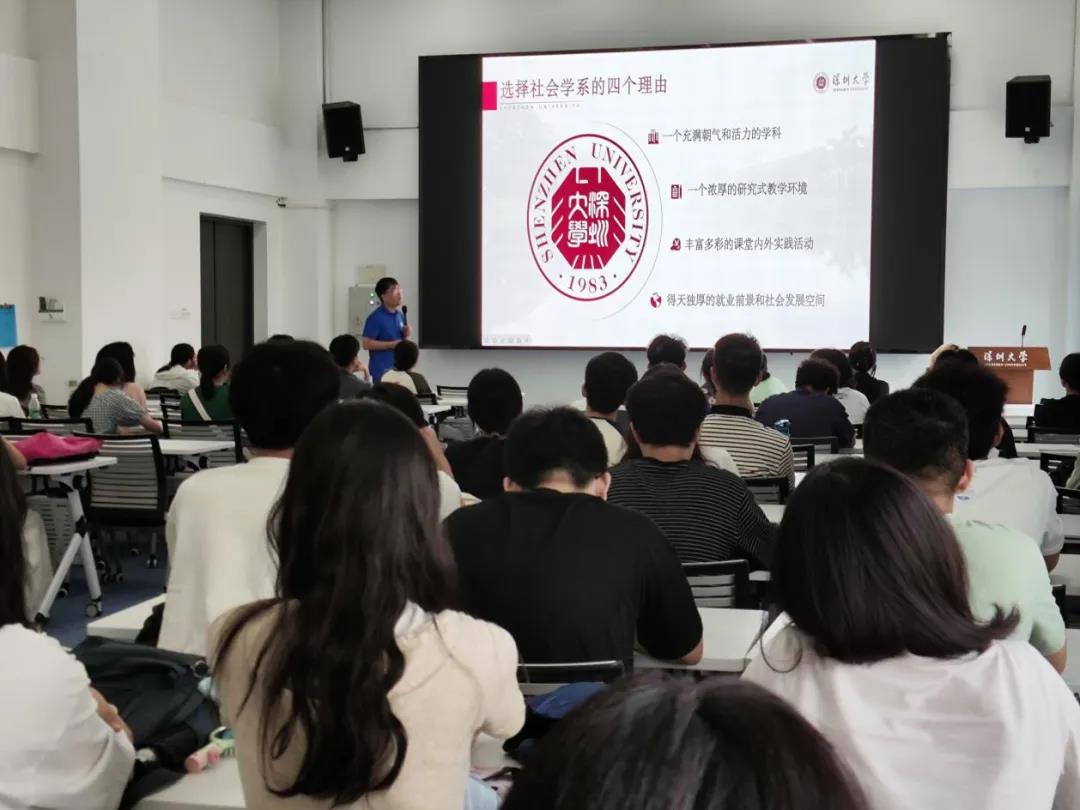 在见面会上,徐老师首先介绍了社会学专业的基本情况,包括学科的历史沿革、研究领域和学术价值。接着,他详细阐述了社会学系的师资力量和科研方向,展示了系内教师的学术成就和研究领域,以及他们在国内外学术界的影响力。在课程体系介绍环节,徐老师强调了社会学系课程的多样性和实践性,说明了我们的课程设置如何培养学生的批判性思维和社会分析能力。此外,他还特别强调了社会学系的培养特色,即注重实践导向,鼓励学生走进田野,走进社会,广泛地开展调查研究。最后,徐老师还分享了社会学系毕业生的升学和就业情况,展示了我院社会学专业的广阔前景和多元化发展路径。