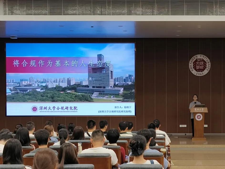 9月3日上午,深圳大学合规研究院研究助理温晓宇为新生们带来题为“将合规作为基本的人生态度”的宣讲。温老师用真实案例引出主题,并从社会、个人等角度来论述合规的重要性。最后,以2023届毕业季廉洁宣传片——《我们》为讲座结尾,寄语所有同学“廉洁从业 逐梦山海”。