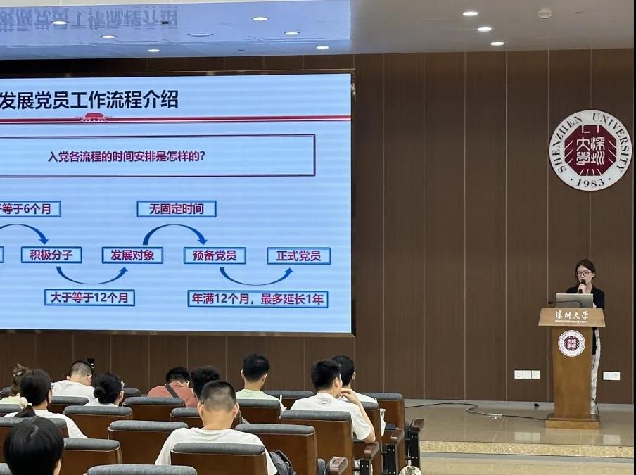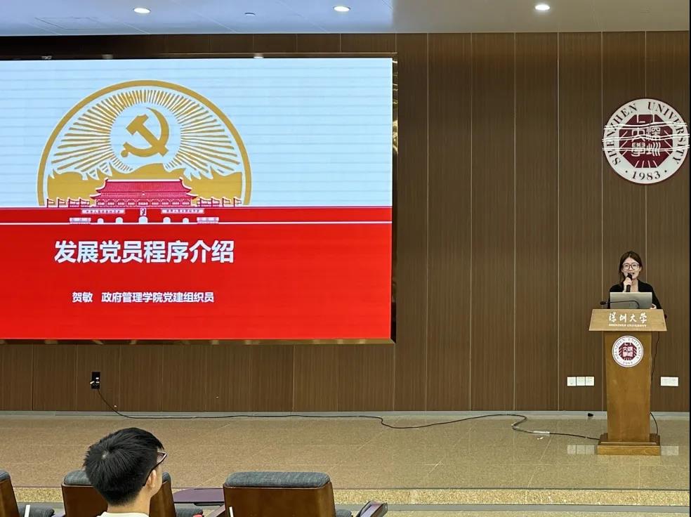 党建组织员贺敏老师对《深圳大学政府管理学院学生党员发展办法》进行了介绍,并就入党流程的五个阶段和二十五个步骤进行了详尽的阐述,强调了端正入党动机和锤炼党性修养的重要性。