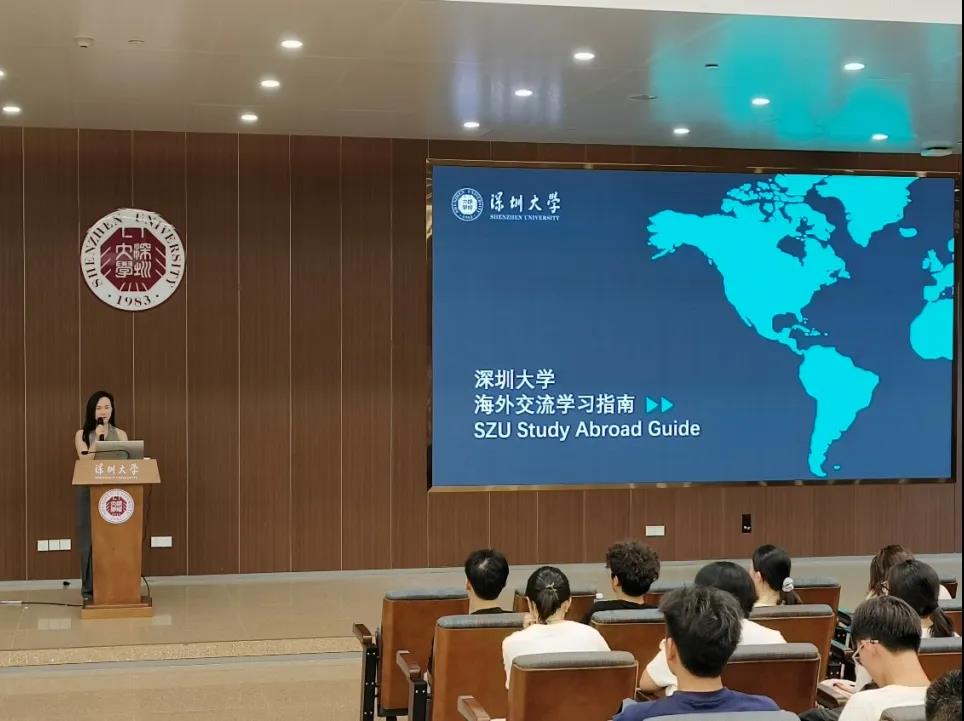 9月3日下午,深圳大学国际交流部老师在启明楼D101报告厅为政府管理学院全体本研新生对学校国际化政策进行了介绍,在深圳大学海外交流学习指南中介绍了海外学习项目类型、学生可交流的国家(地区)与申请条件、学分转换与认证制度等信息。