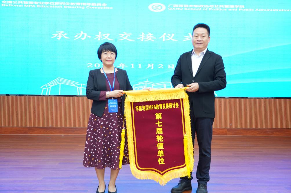 本届大会进行了研讨会承办权的交接仪式,第六届研讨会组委会代表张雄教授将会议承办的锦旗传递给第七届组委会代表、深圳大学政府管理学院副院长吴海燕教授,第七届华南地区MPA教育发展研讨会将由深圳大学承办。