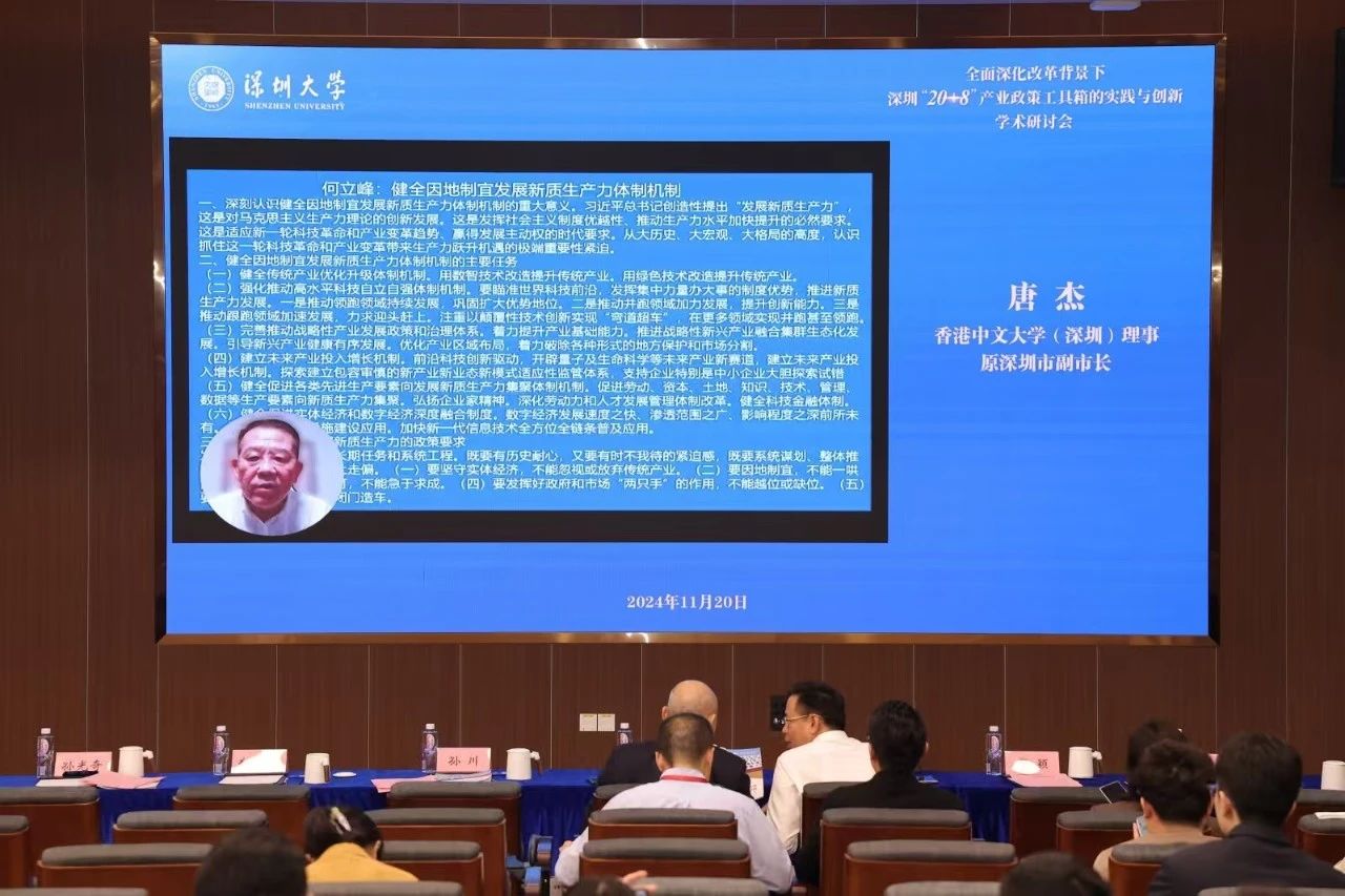 2024年11月20日,深圳大学粤港澳大湾区新兴产业发展研究院在深圳大学丽湖校区成功举办了“全面深化改革背景下深圳‘20+8’产业政策工具箱的实践与创新”学术研讨会。此次会议聚焦全球科技革命和产业变革背景,汇集了来自政府、学术界及企业界的知名专家与重量级嘉宾,深入探讨如何通过产业政策创新应对国内外环境的复杂变化,助推深圳经济高质量发展。