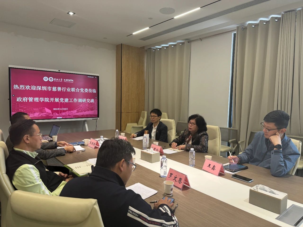 11月22日上午,深圳市慈善行业联合党委刘国玲一行到访深圳大学政府管理学院,探讨校社党建共建新路径。学院党委书记何燕辉、副书记张国强出席会议。会议由行政管理系系主任罗文恩副教授主持。