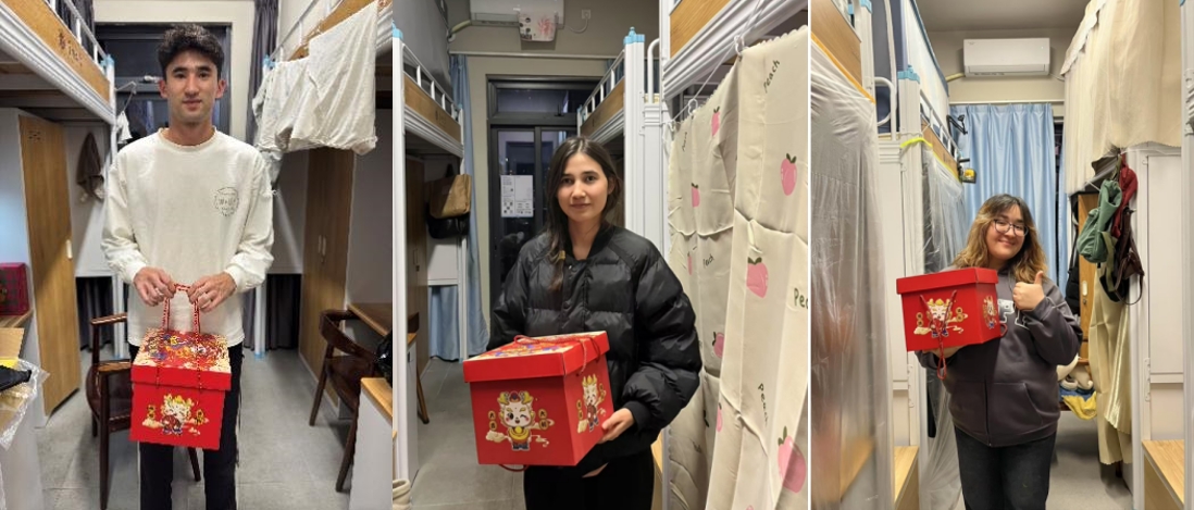 除夕当天,师生代表携手走访宿舍,为仍留校的同学送上零食大礼包,叮嘱假期用电安全,希望同学们在校期间度过一个平安祥和、幸福温暖的春节。