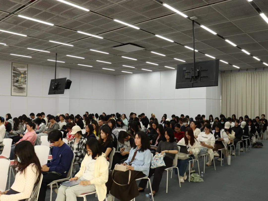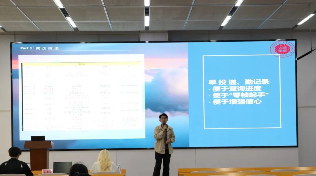 在朋辈分享会环节,四位优秀学生代表结合自身经历,围绕访学交流、求职实习等话题,向同学们分享了成长经验与实践体会。