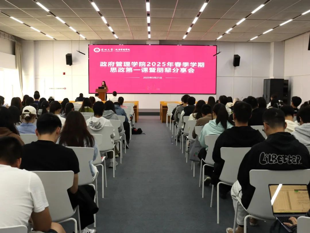2025年3月21日下午,政府管理学院在丽湖校区文韬楼236映雪厅举行2025年春季学期思政第一课暨朋辈分享会。学院党委书记何燕辉、执行院长陈文教授、党委副书记张国强出席活动。2022级社会学专业白莹禛、2021级行政管理专业金圣淋、2024级政治学专业李根、2022级社会工作专业林敏悦四位优秀学生代表应邀分享海外研学与求职实习经验。学院170余名本科生、研究生参加了此次活动。活动由学院党务行政秘书罗文婷主持。