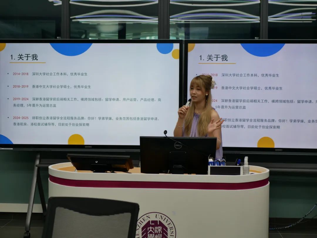 李嘉璐校友,现专注于香港留学全链路服务,自创品牌“你好,学弟学妹-HK版”。她向同学们分享在求学和求职过程中应该要培养的专业素质和能力,并强调要在自己感兴趣的领域多加探索,帮助同学们扫清对未来的迷茫。