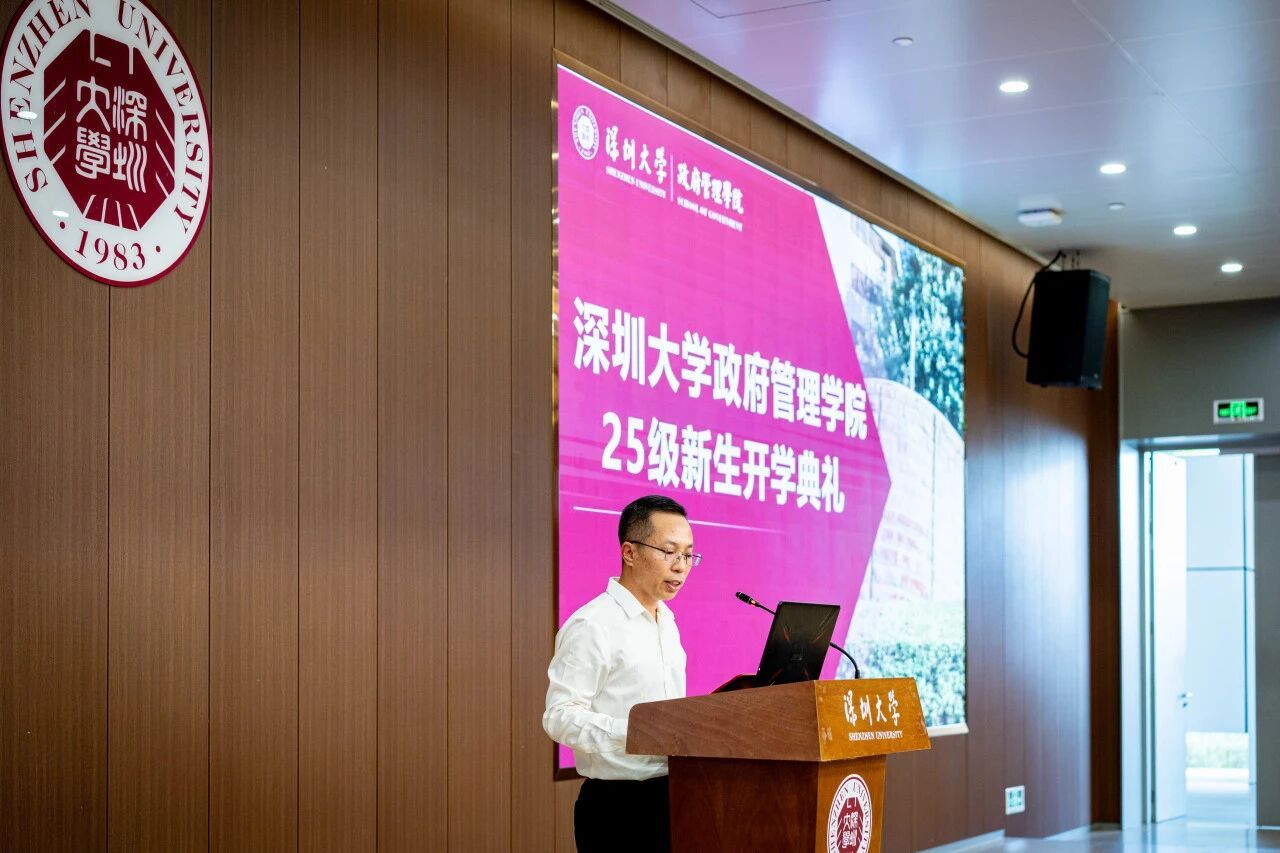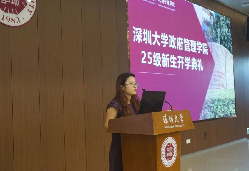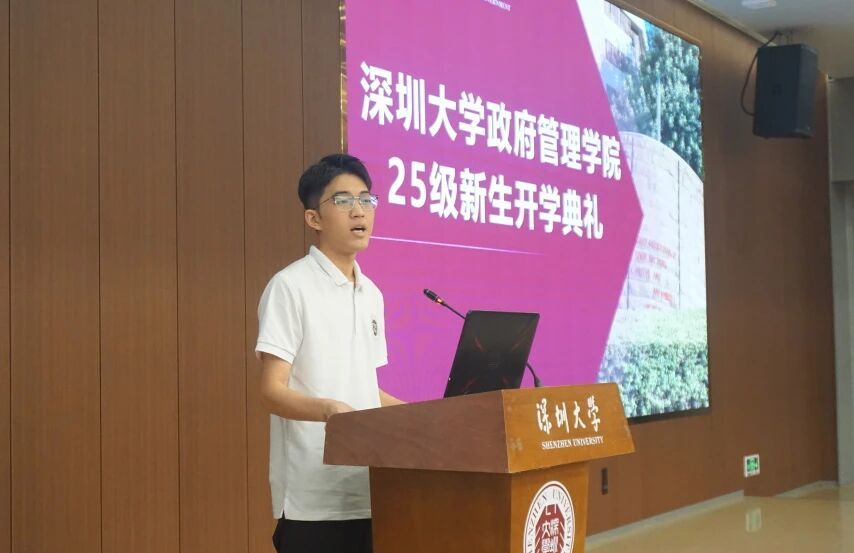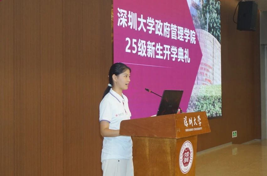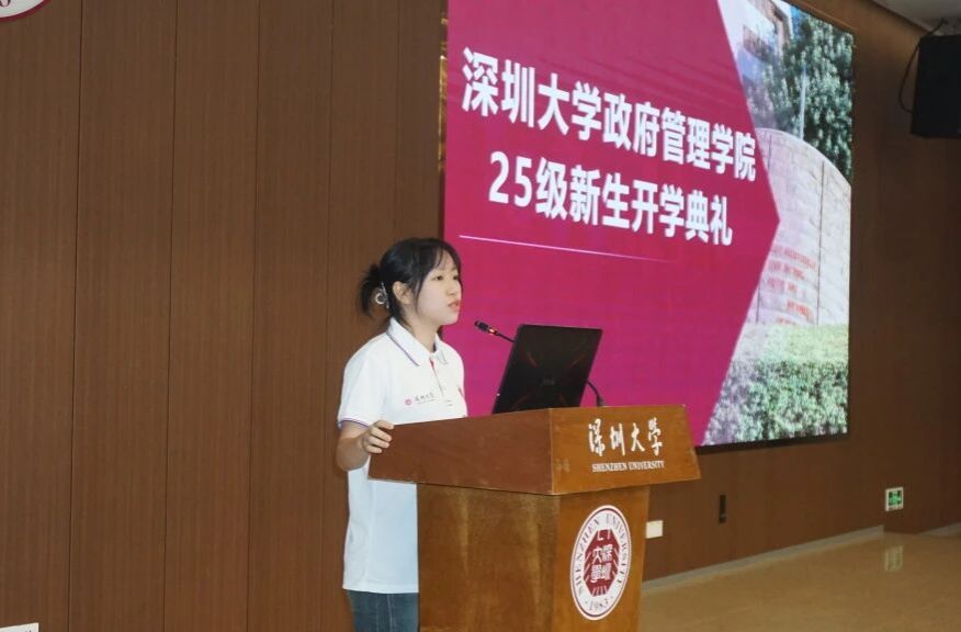 研究生新生代表丘嘉沁同学发言。她表达了对在深大继续深耕、持续深造的憧憬与期盼。她指出,深圳这座城市和深大政管学院为研究学习提供了宝贵平台与鲜活样本,呼吁同学们坚守信念,积极求学,勇于实践,将论文写在祖国大地上,用青春回应时代呼唤。