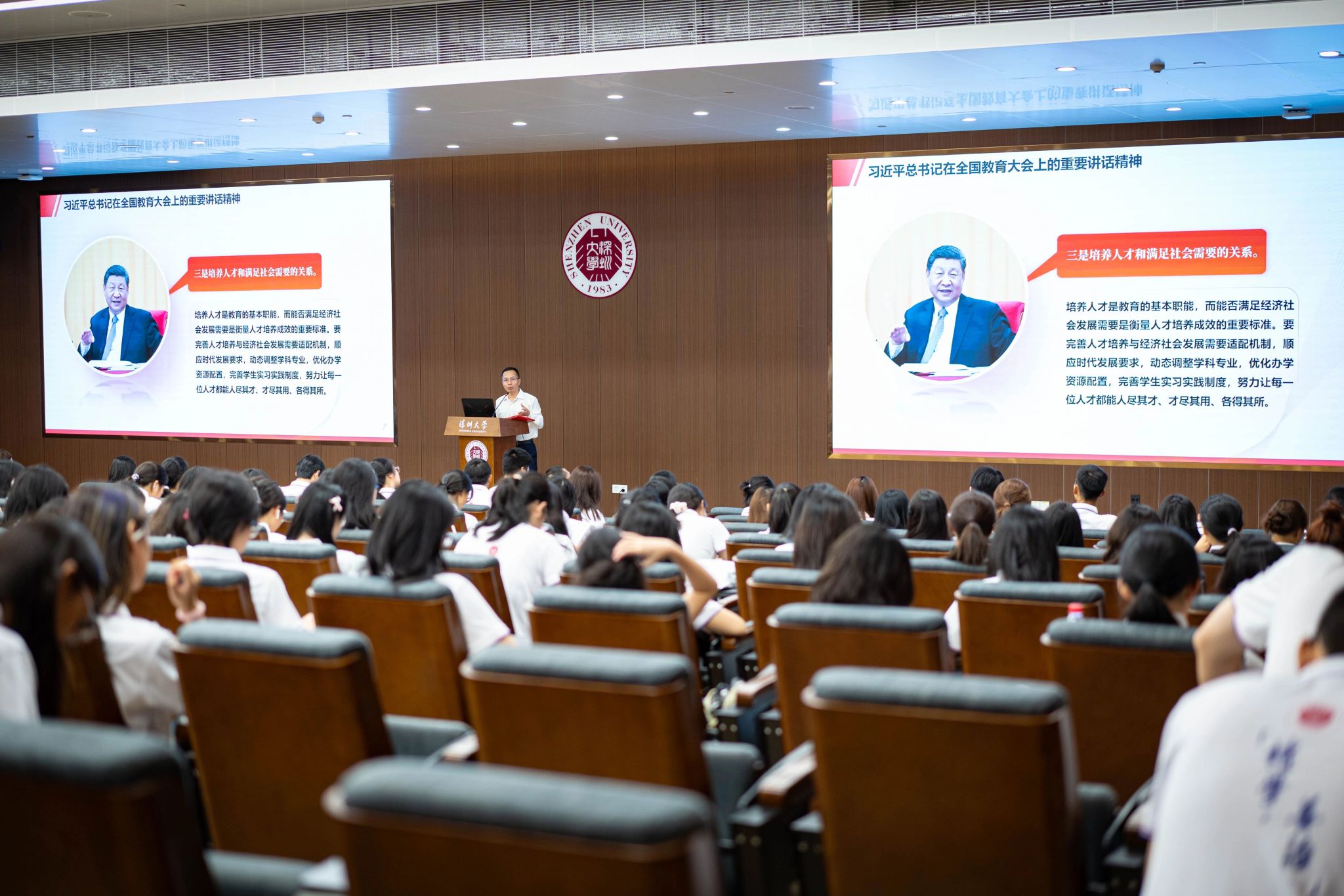 陈文以“深入学习贯彻习近平总书记关于教育的重要论述”为题,带领新生学习领悟了习近平总书记在全国教育大会上的重要讲话精神,并详细阐释了建设教育强国需要把握的几个重要关系。随后,他结合当前的国际形势,帮助同学们理解何谓世界百年未有之大变局,并教导同学们要学会从宏观背景出发思考现实问题。结合教育发展要求和时代背景,他详细介绍了学校和学院的办学优势,以及目前取得系列成果。在此基础上,他提出学院将持续推动“国际化、实践化、数智化、理论化、特色化”建设,并鼓励同学们将个人规划与学院发展相结合,努力成长为具备专业知识、实践能力、国际视野、数智意识和特色优势的高素质人才。
