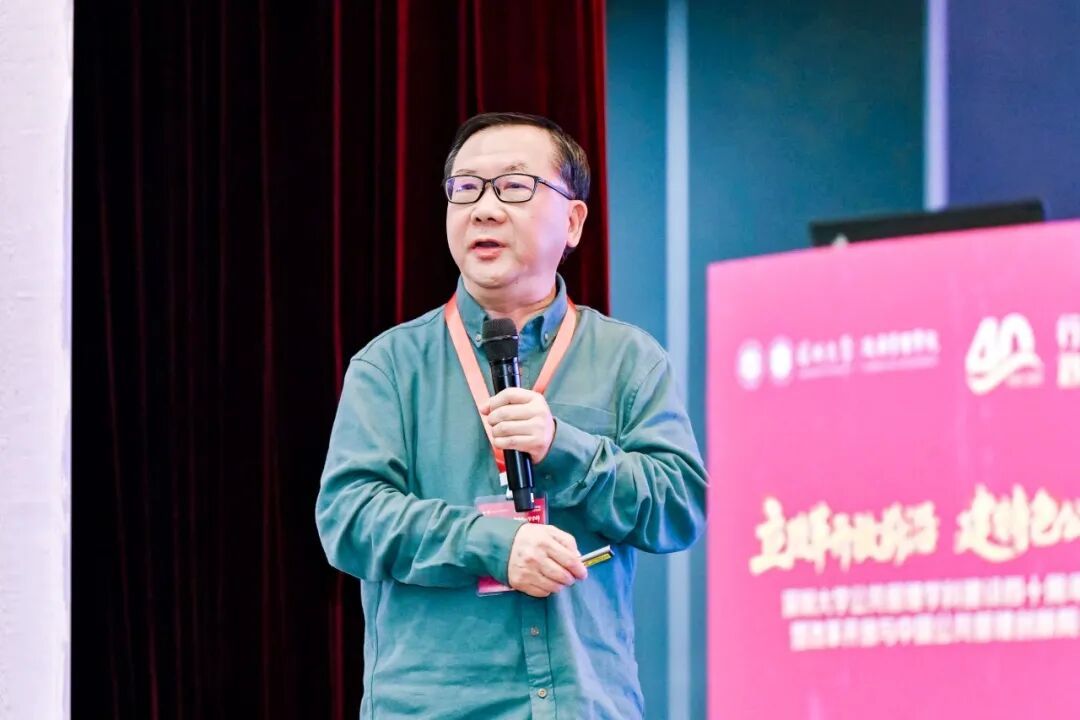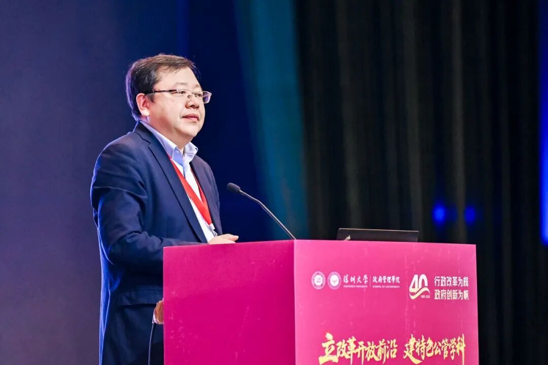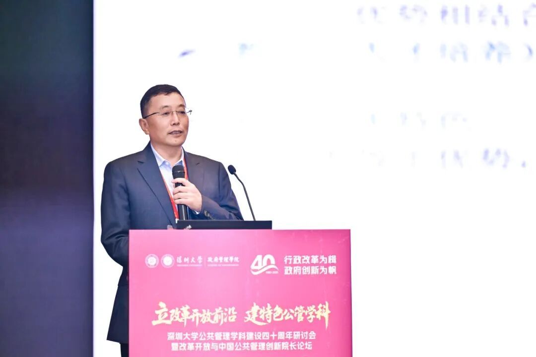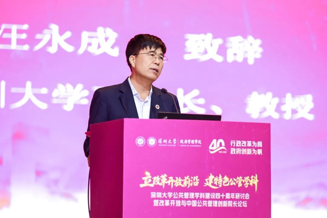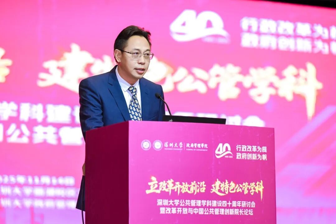 中国人民大学公共管理学院院长、教授严金明在致辞中向深圳大学政府管理学院全体师生及海内外院友致以祝贺,指出深圳是改革开放的“试验田”“先行地”,深大公共管理学科伴随改革开放而生,与经济特区发展同频共振,与改革开放同向前行,立足深圳、扎根湾区,回应国家治理现代化的现实需求,产出了一批高质量的研究成果。深圳作为改革开放窗口和创新前沿,为公共管理学科提供了独一无二的成长沃土和思想源泉,深大公管学科在服务地方治理现代化、跟踪研究地方政府改革创新、探索超大特大城市发展新模式等方面成果突出,形成了鲜明的学科特色,为粤港澳大湾区输送了一大批高素质公共管理人才。展望未来,他希望沿袭中国人民大学与深圳大学的深厚历史渊源,以两院签订的合作协议为基础推进相关合作,呼吁双方与学界同仁共同肩负新时代使命:一要扎根中国大地,立足中国式现代化实践,总结提炼具有中国特色和时代精神的公共管理理论体系,构建自主知识体系;二要回应时代之问,紧紧围绕国家治理体系和治理能力现代化需求,聚焦关键领域提供高质量解决方案;三要坚持开放包容,加强国际对话交流,在文明互鉴中推动中国公共管理学科走向世界;四要全心立德树人,坚守为党育人为国育才初心,培育时代新人。他祝愿该学科以四十年庆典为里程碑和新起点,继往开来,再创辉煌。