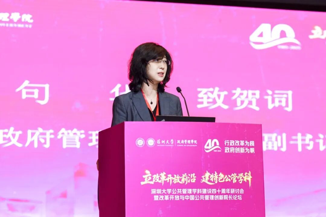 作为兄弟高校代表,北京大学政府管理学院党委副书记、教授句华对深大公共管理学科建设四十周年表示热烈祝贺,指出深圳经济特区建立伊始,北京大学就积极参与了深圳大学的筹建,两校合作由来已久,深大公共管理学科自1985年筹建行政学系以来成绩有目共睹,1986年创办行政管理学专业班,1987年主编《行政管理学专业系列教材》,这些开创性工作不仅体现了令人瞩目的“深圳速度”,也为全国行政管理学科发展与人才培养做出了贡献。四十年来该学科始终紧扣国家与地方治理的重大现实需求,在行政管理、公共政策、城市治理、社会组织管理等领域形成了特色。面向未来,她期待深大公管学科抓住中国特色社会主义先行示范区和粤港澳大湾区的历史机遇打造学科优势,为中国式现代化治理提供学理支撑;以特区湾区视野融通中外,搭建国际化学术交流平台;以改革创新精神凝心聚力,培养更多胸怀天下的公共管理人才。最后她衷心祝愿该学科基业长青,再创辉煌。