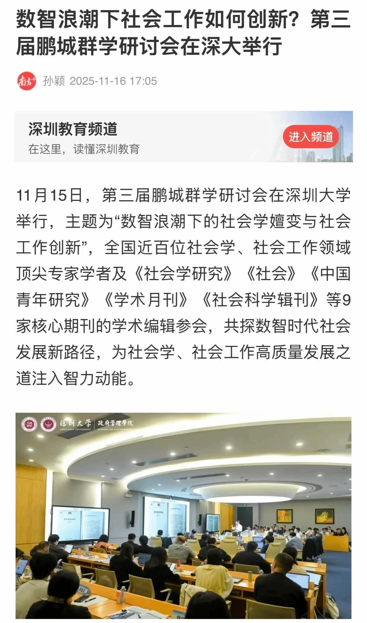 第三届鹏城群学研讨会昨日在深圳大学顺利举行。本次研讨会以“数智浪潮下的社会学嬗变与社会工作创新”为主题,汇聚全国近百位社会学、社会工作领域顶尖专家学者及《社会学研究》《社会》《中国青年研究》《学术月刊》《社会科学辑刊》等9家核心期刊的学术编辑参会,共探数智时代社会发展新路径,为社会学、社会工作高质量发展之道注入智力动能。