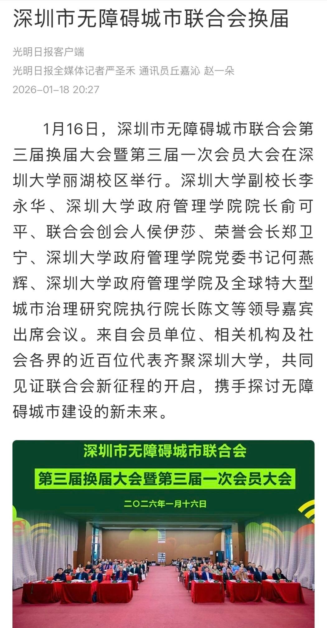 2026年1月16日,深圳市无障碍城市联合会第三届换届大会暨第三届一次会员大会在深圳大学丽湖校区隆重举行。深圳大学副校长李永华、深圳大学政府管理学院院长俞可平、联合会创会人侯伊莎、荣誉会长郑卫宁、深圳大学政府管理学院党委书记何燕辉、深圳大学政府管理学院及全球特大型城市治理研究院执行院长陈文等领导嘉宾出席会议。来自会员单位、相关机构及社会各界的近百位代表齐聚深圳大学,共同见证联合会新征程的开启,携手探讨无障碍城市建设的新未来。