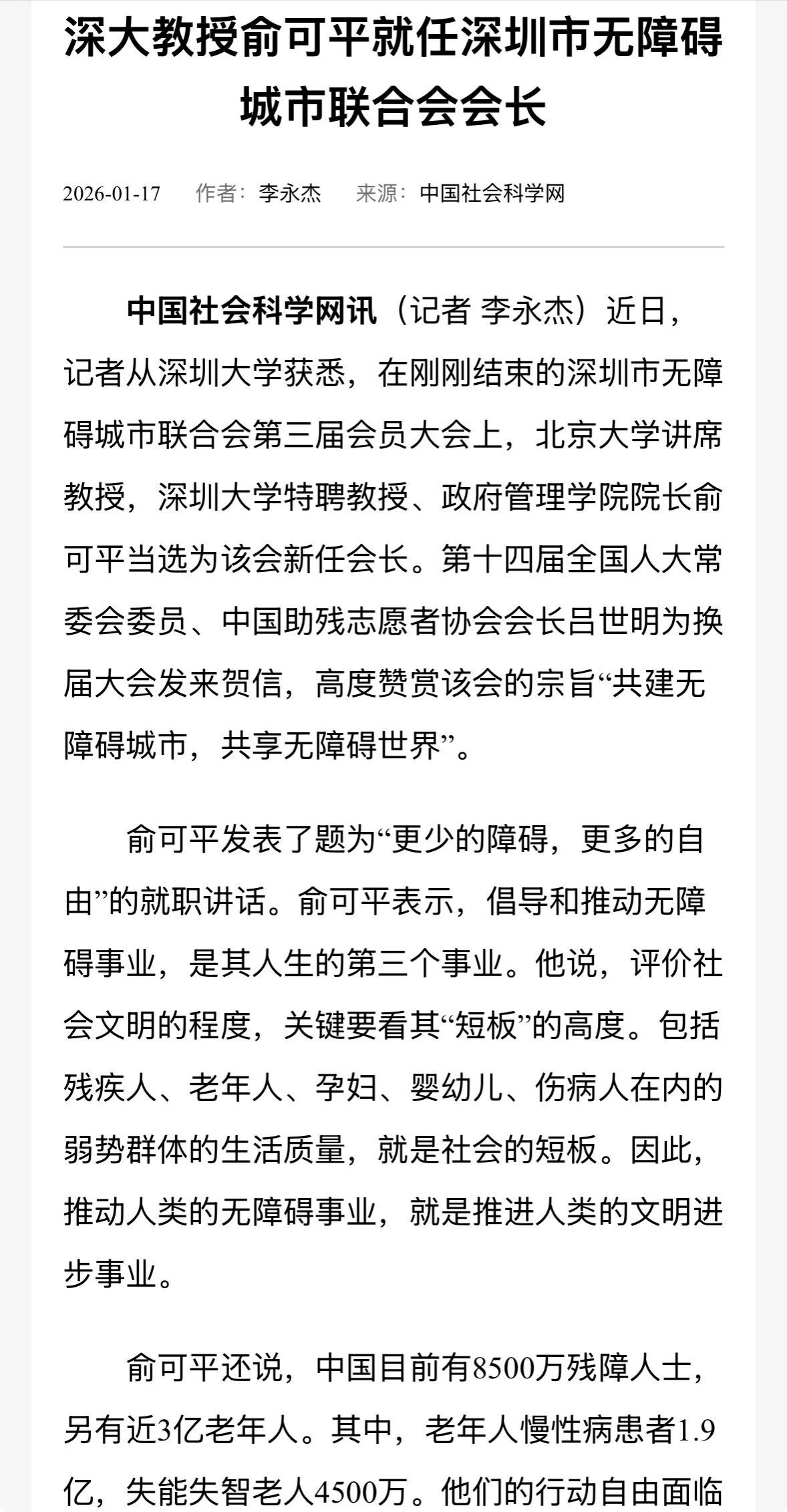 俞可平教授表示,将秉持“增量发展”原则继承发扬联合会优良传统与有益实践,并在存量基础上实现新的突破。同时,他也呼吁社会各界“有智出智,有力出力”,凝聚多方合力,共同推进无障碍城市建设,为深圳乃至全国无障碍事业发展贡献力量。