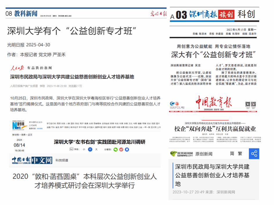 推进乡村振兴、共同富裕等国家战略亟需在创新创业人才培养中突出公共价值导向,培育一批能够引领社会创新、解决社会痛点问题的社会型创新创业人才。2015年深圳大学依托行政管理专业创办“公益创新专才班”(简称“益才班”)特色项目,在全国率先探索公益创新创业人才培养路径。2017年该专业获批广东省特色专业建设点,确立“社会创业家”培养目标,着力培养具备公共情怀和公益精神,拥有复合专业知识结构,善于运用创新商业模式解决社会问题的新型公共管理人才。