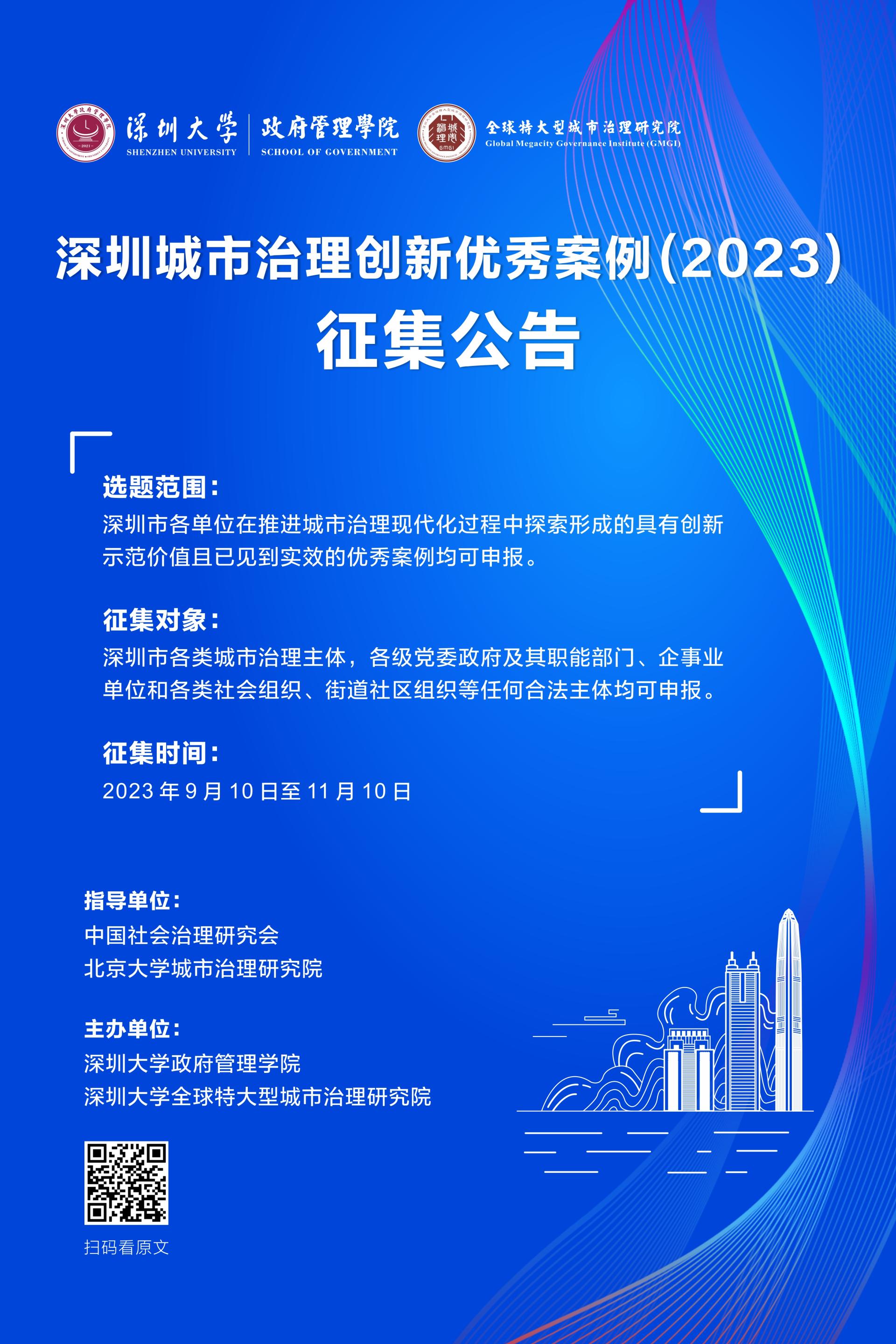 为更好地总结研究深圳城市治理优秀实践案例,为城市治理体系和治理能力现代化建设提供更多可复制、可推广的先行示范创新经验,深圳大学政府管理学院、深圳大学全球特大型城市治理研究院联合中国社会治理研究会、北京大学城市治理研究院,将于2023年9月—12月在深圳市范围内组织开展城市治理创新优秀案例(2023)征集活动。现将有关事项公告如下: