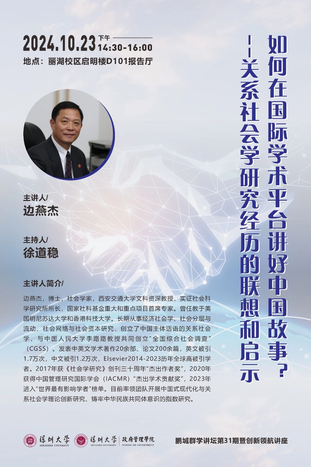 题目:如何在国际学术平台讲好中国故事?——关系社会学研究经历的联想和启示摘要:习近平总书记要求我国哲学社会科学工作者讲好中国故事。我开展关系社会学研究的多年体会是,把握理论知识关联性是在国际学术平台发表中国研究成果、讲好中国故事的关键要领。理论知识关联性可以分解为场域拓宽关联、机制重塑关联、视角变换关联等三种形式。本讲座以三篇论文为例,分别讨论上述三种理论关联形式的含义和实现策略,分享我的一些联想与启示,以期推动中国社会研究成果的国际化,让世界更好地了解中国。