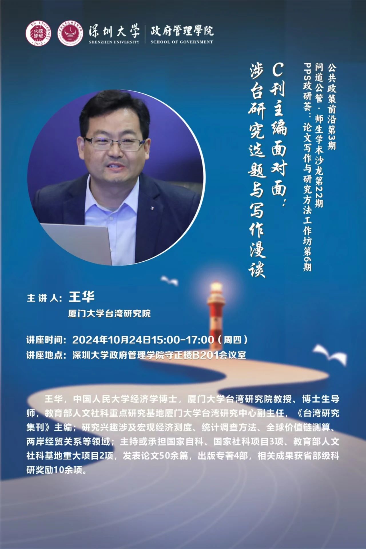 王华,中国人民大学经济学博士,厦门大学台湾研究院教授、博士生导师,教育部人文社科重点研究基地厦门大学台湾研究中心副主任,《台湾研究集刊》主编;研究兴趣涉及宏观经济测度、统计调查方法、全球价值链测算、两岸经贸关系等领域;主持或承担国家自科、国家社科项目3项、教育部人文社科基地重大项目2项,发表论文50余篇,出版专著4部,相关成果获省部级科研奖励10余项。