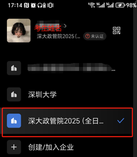 4.请提前下载好复试所需的企业微信(手机端),目前所有参与复试的考生已在企业微信中开设有效账户,考生需使用手机号登录,点击手机企业微信APP界面右下角图标,确认本人所属企业为“深大政管院2025(全日制)研究生复试”,确认本人在复试小组中显示的名字为实名,无须更改,显示如下: