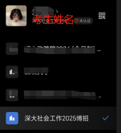 复试采用现场复试的方式。请提前下载好复试所需的企业微信(手机端),目前所有参与复试的考生已在企业微信中开设有效账户,考生需使用手机号登录,点击手机企业微信APP界面右下角图标,确认本人所属企业为“深大社会工作2025博招”,确认本人在复试小组中显示的名字为实名,无须更改,显示如下图。