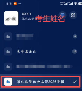 复试采用现场复试的方式。请提前下载好复试所需的企业微信(手机端),目前所有参与复试的考生已在企业微信中开设有效账户,考生需使用手机号登录,点击手机企业微信APP界面右下角图标,确认本人所属企业为“深大政管社会工作2026博招”,确认本人在复试小组中显示的名字为实名,无须更改,显示如下图。