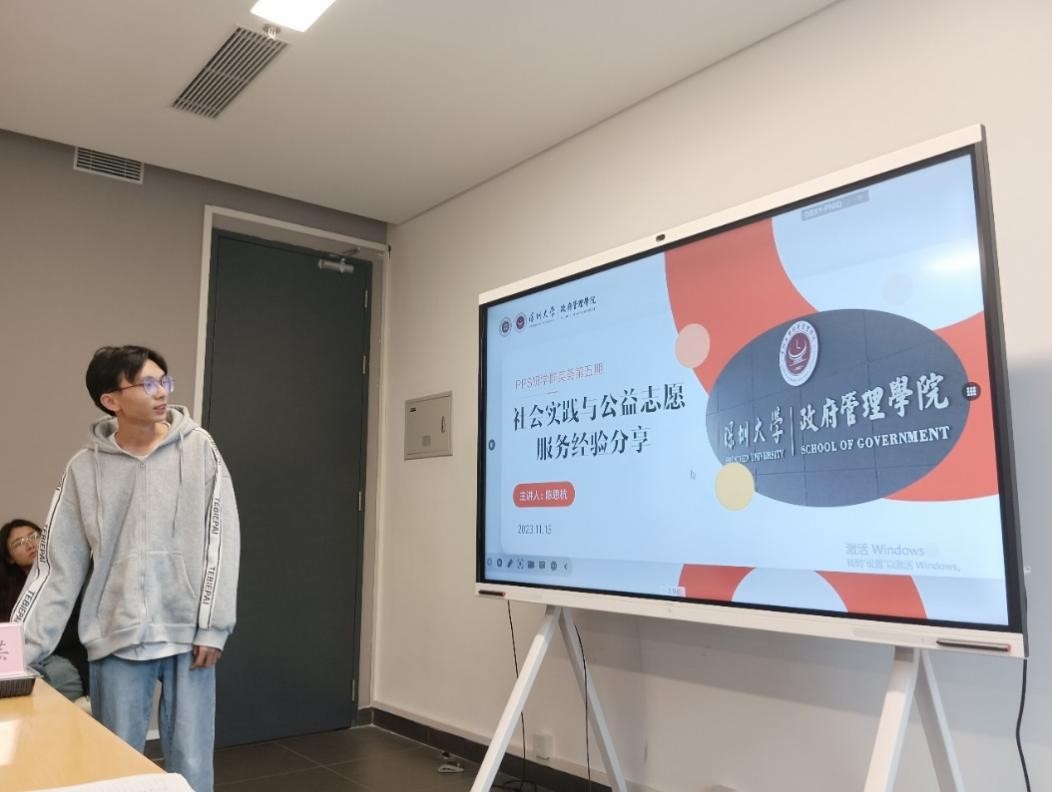 最后一位分享者是社会实践经验相当丰富的陈思杭同学,他详细介绍了自己的学生干部经历、社团经历、公益志愿服务经历以及实习经历,针对如何能参加社会实践活动、如何能参加公益志愿服务活动以及参与此类活动的意义,为在座的同学们提供了满满干货。同时,他也针对大学的不同阶段提出了阶段性的规划建议,以一句“阳光雨露,皆为恩泽”收获了大家的热烈掌声。