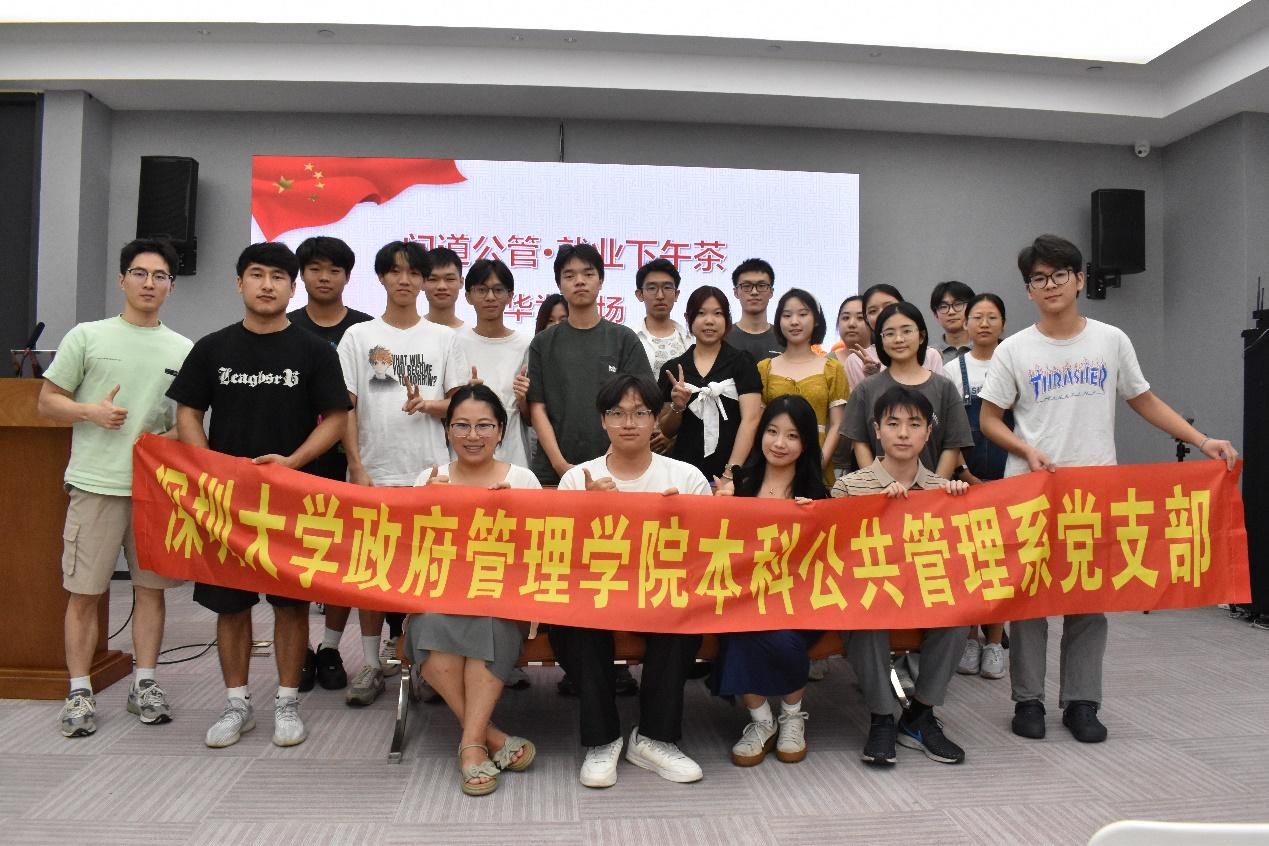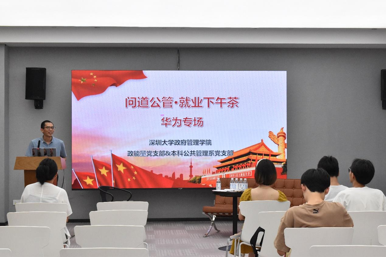 2024年6月20日下午,政府管理学院政能量党支部、本科公共管理系党支部与公共管理协会于守正楼A213联合举办了问道公管·就业下午茶(华为专场)活动,活动旨在搭建应届毕业生与其他在校年级学生的就业交流平台,促进各阶段党支部成员更好地进行就业规划,交流就业经验,充分发挥应届优秀毕业生的朋辈引领作用。政府管理学院党委副书记张国强,政府管理学院政能量党支部书记耿旭副教授,本科公共管理系党支部组织委员杨毓娜,2020级行政管理专业3位已被华为技术有限公司录用的毕业生张航、魏正男、林洁憧及数十位本科生积极分子、发展对象共同参与本次活动。活动由本科公共管理系党支部预备党员金圣淋主持。