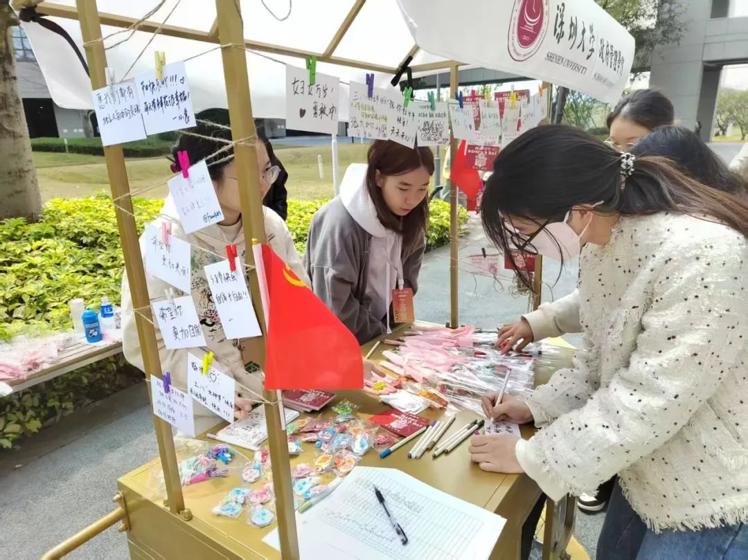 当天中午11时,学院党建促进会在丽湖校区二期三角梅楼前空地同步开展“党旗领航绽芳华”社区关怀活动,为女性师生送上康乃馨与节日贺卡。参与者们纷纷在贺卡背面写下对党的祝福、个人成长目标或女性互助倡议及心愿,完成心愿墙的互动后,还获得了精美的定制小奖品,吸引众多师生驻足。