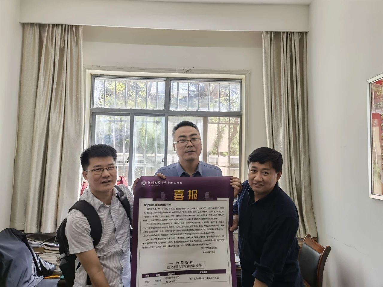 4月25日下午,段哲哲、齐腾飞老师走进西北师范大学附属中学与中学负责老师座谈交流,双方围绕高考填报志愿、深大招生政策等相关议题展开深入交流。座谈会后,段老师和齐老师代表学校向西北师范大学附属中学送上优秀学子喜报,双方合影留念。
