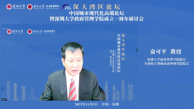 院庆启动仪式后,深圳大学政府管理学院院长、全球特大型城市治理研究院院长俞可平教授致辞。俞院长指出,当前,中国正在全面建设社会主义现代化国家,大规模的城市化是国家现代化的重要内容,也是世界各国现代化的必经之路。迅速而大规模的城镇化,正是改革开放以来中国创造的众多具有世界历史意义的伟大奇迹之一。中国式现代化,既有各国现代化的共同特征,更有基于国情的中国特色。因此本次论坛聚集“中国城市现代化”的核心主题,深入研讨世界城市现代化的一般规律和中国城市现代化的个性特征。中国城市化的一个显著特色,即涌现出一批特大型和超大型城市。俞院长特别强调,鉴于特大型城市在中国现代化进程中的特殊重要性,以及深圳作为特大型城市的成功实践,政府管理学院将把特大型城市作为学院的重点研究领域之一。