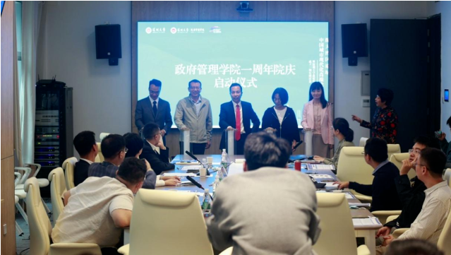毛校长致辞后,由陈文书记、黄斌欢副院长、唐娟教授、周林刚教授及刘筱教授按亮启动键,正式启动政府管理学院一周年院庆。