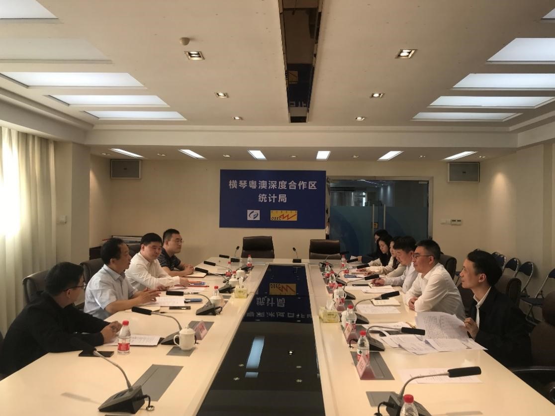 随后,调研组一行与横琴粤澳深度合作区统计局开展了座谈。横琴统计局局长李国辉主持会议,统计局副处长邹贤康、经济发展局、法律事务局以及横琴创新发展研究院的相关领导干部与研究人员参加交流研讨。经济发展局李成杰深入介绍了横琴粤澳深度合作区产业发展总体情况。邹贤康指出,横琴粤澳深度合作区是一项没有先例可循的创新实践,通过多年的潜心摸索与苦心经营,目前的核心政策可以归纳为“5+1+1”模式,即五大自由便利(贸易自由、投资自由、跨境资金流动自由、人员流动自由、信息流动自由),加上一套趋同港澳的全新税收政策安排,再加上一套衔接澳门接轨国际的规则体系。
