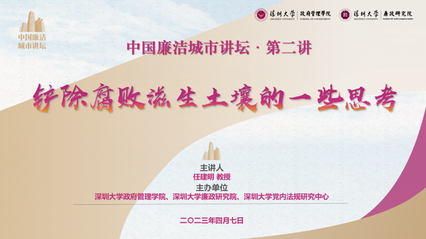 4月7日下午,由深圳大学政府管理学院、廉政研究院、党内法规研究中心主办的中国廉洁城市讲坛第二讲顺利举行。本期讲坛邀请到中国管理现代化研究会廉政分会理事长、北京航空航天大学廉洁研究与教育中心主任任建明教授主讲“铲除腐败滋生土壤的一些思考”。讲坛由政府管理学院副院长、廉政研究院副院长谷志军教授主持,政府管理学院100余名师生参加了本次讲座。
